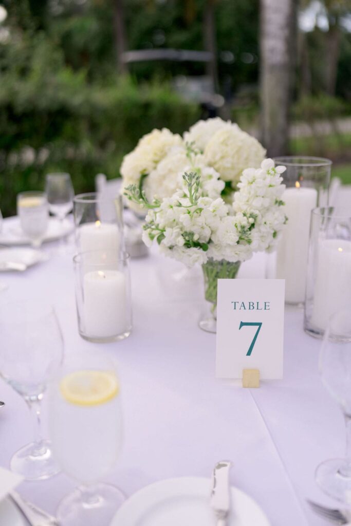 We wanted to incorporate other flower varieties into the tented wedding reception as dark blue is not a common color in the flower world. So, we went with the blue cornflower, which was perfect! We designed some bud vases using the blue cornflower and other white blooms that looked stunning in the tented reception space at Jekyll Island Club.