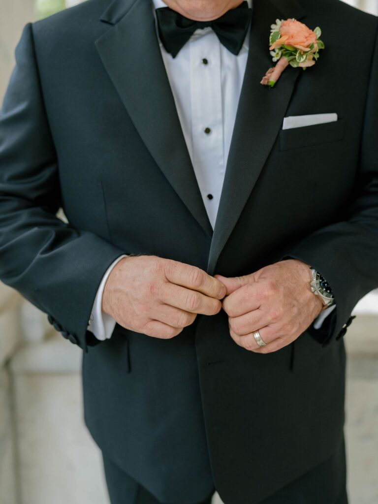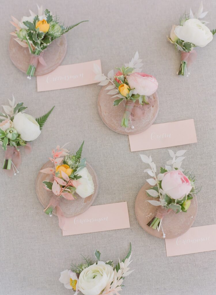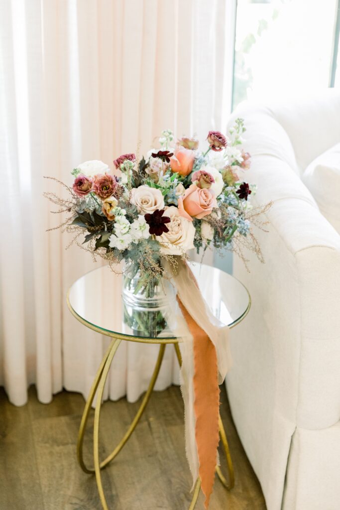 Sarah’s bridal bouquet was a beautiful collection of white textured flowers with pops of peaches, pinks, and burgundy. We loved how this palette turned out and enjoyed incorporating it into smaller versions for the bridesmaid’s bouquets. For Alex’s groom’s boutonniere, we chose a unique textured flower called the blushing bride, which was very fitting for this wedding design.