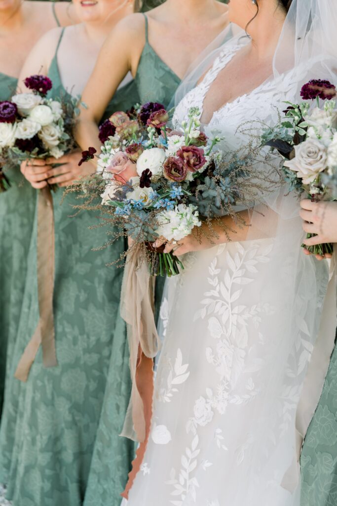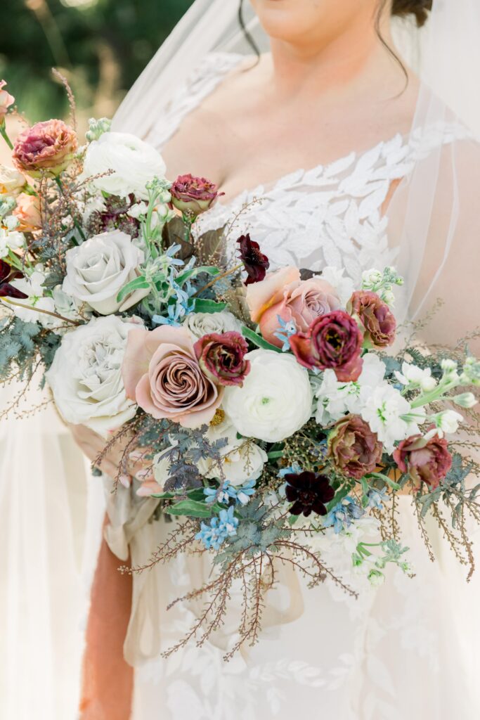 For this fall wedding, our couple opted for a wedding color palette with dusty rose and navy blue. So, we incorporated muted fall tones that matched their wedding color palette into the bridal bouquet and bridesmaid bouquets. In addition, our team opted for a mix of textured florals ranging from Scabiosas to Delphiniums and even Butterfly Ranunculus for the bouquets and finished them off with delicate silk ribbon.