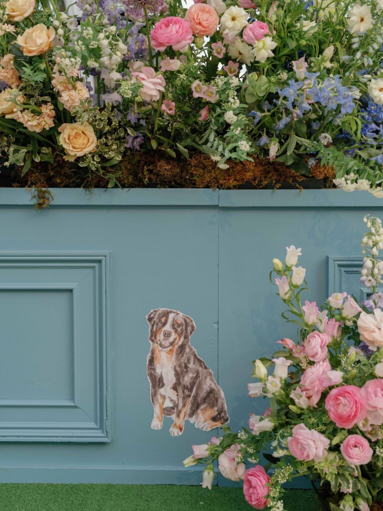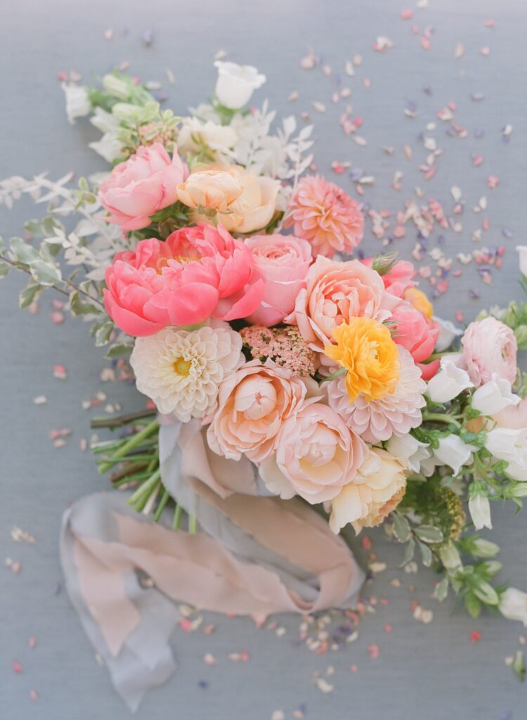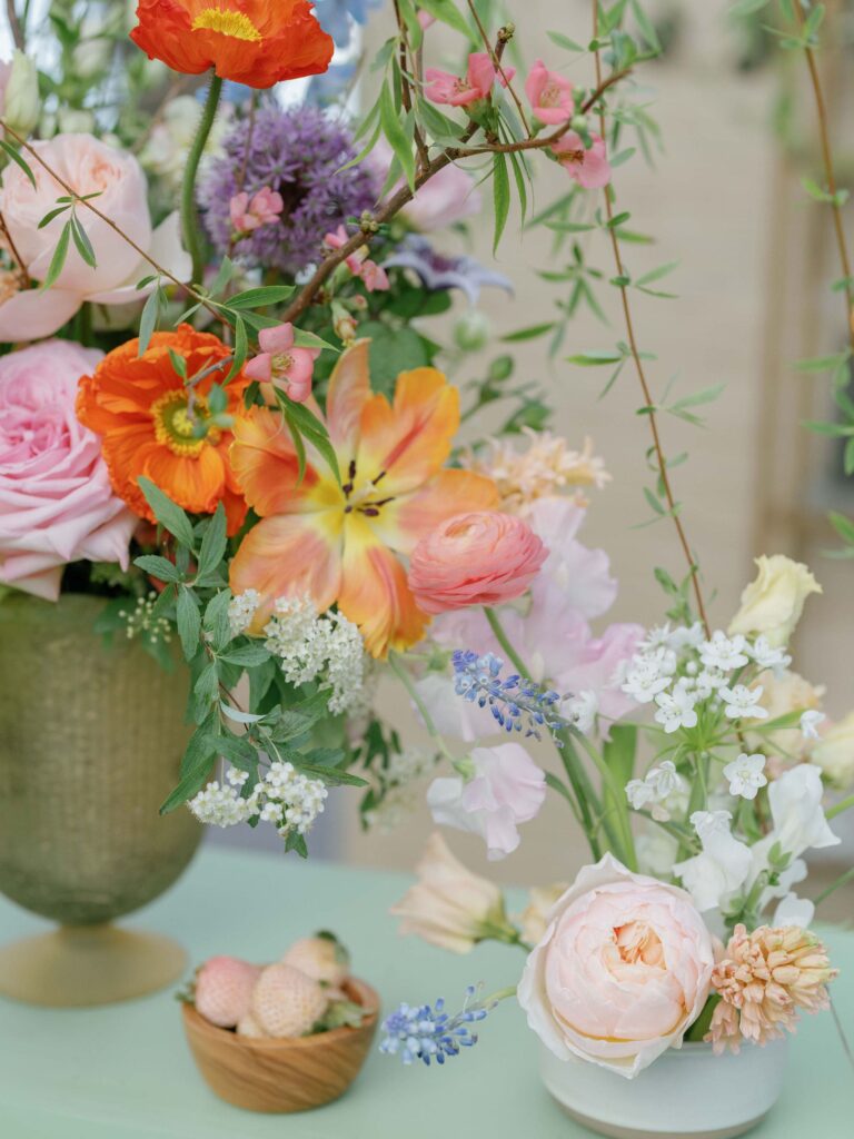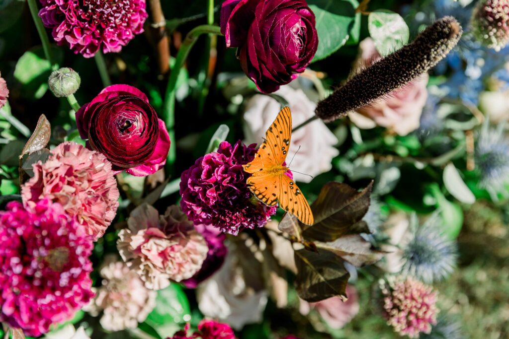 The flowers I chose for Joanna and Eric’s wedding were a true celebration of nature’s beauty and a celebration of Joanna’s happy and colorful design. We incorporated a variety of blooms, including pink peonies, garden roses, delphiniums, ranunculus, dahlias, campanulas, and preserved Italian ruscus. These flowers added layers of depth and texture to the arrangements, creating a visually captivating display. To enhance the overall aesthetic, I included yarrow, ferns, Italian variegated pittosporum, solidago, spray roses, snapdragons, tulips, and butterfly ranunculus. These additional elements added pops of color and an organic touch to the design.