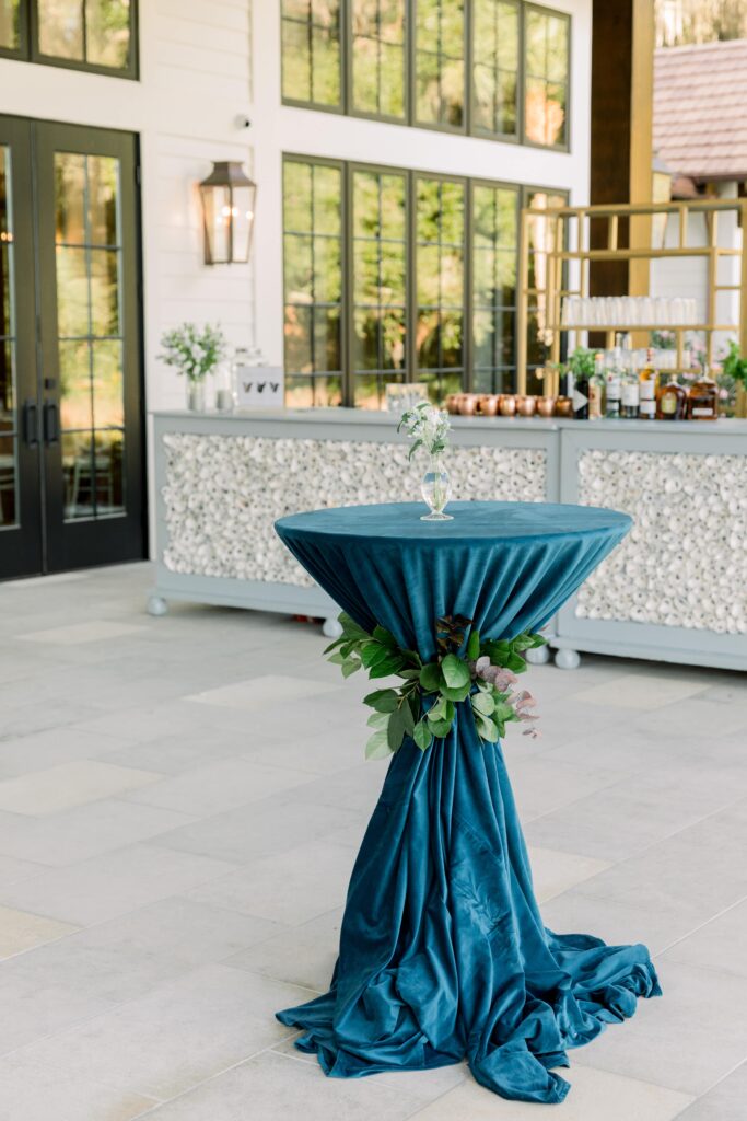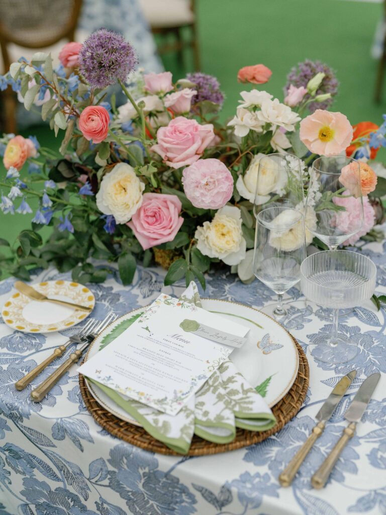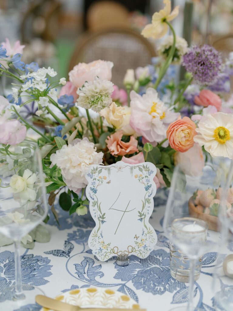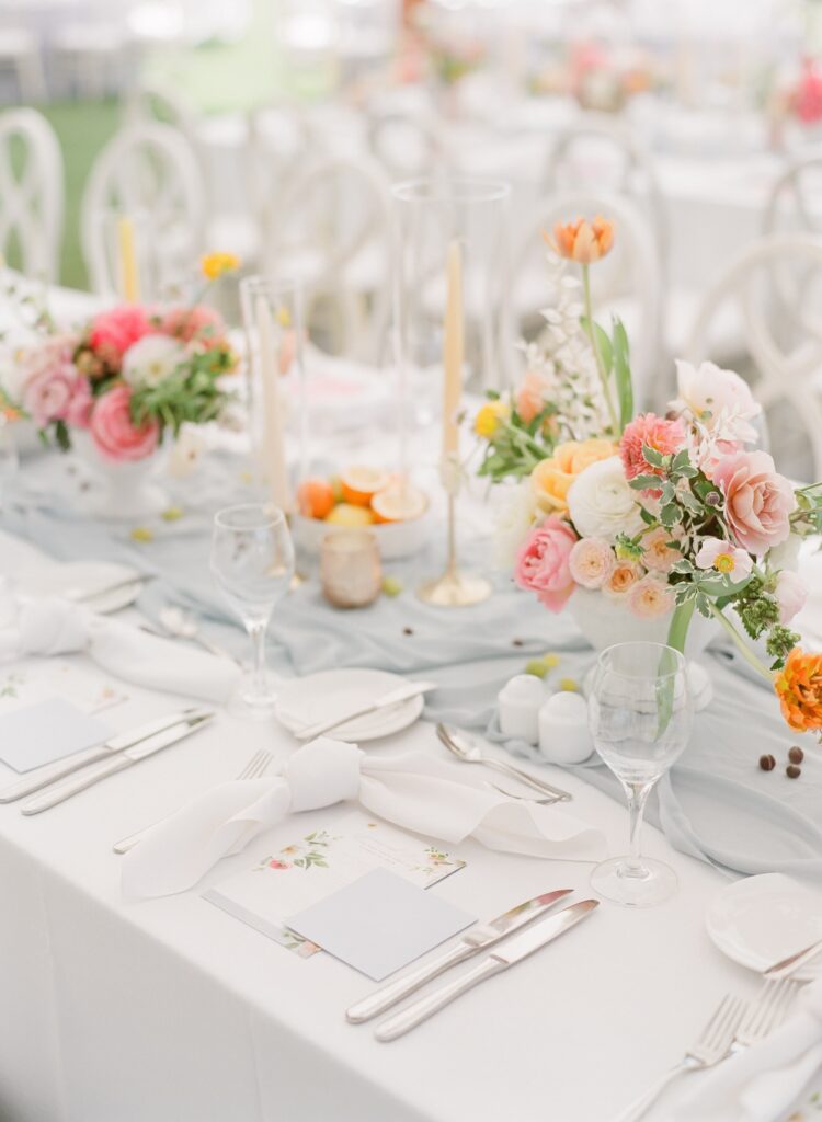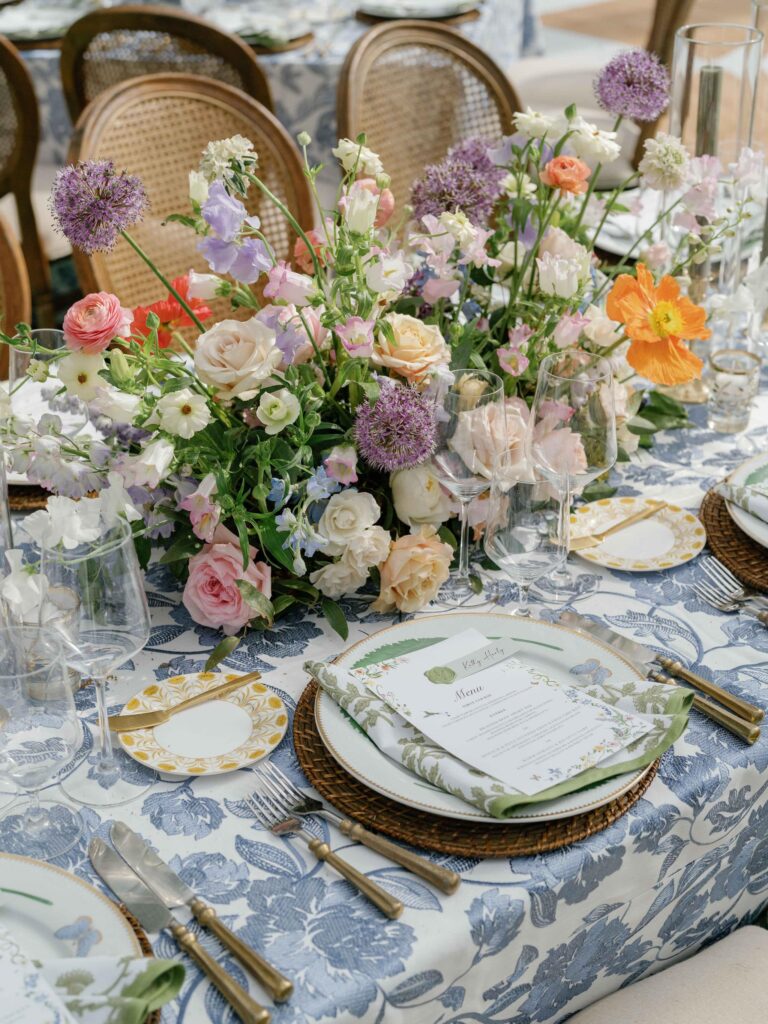 To create a seamless transition from the rehearsal dinner to the wedding day, we repurposed the florals from the previous evening. With a different color palette for the rehearsal dinner, we carefully incorporated pops of blue to harmonize the look and feel.