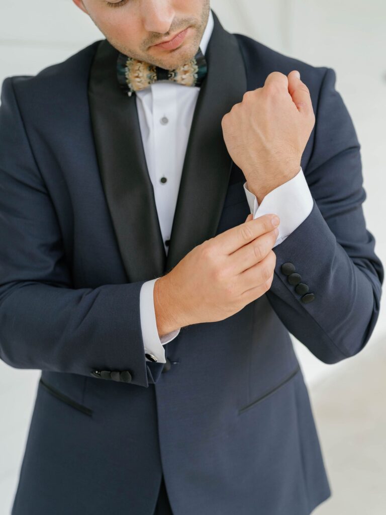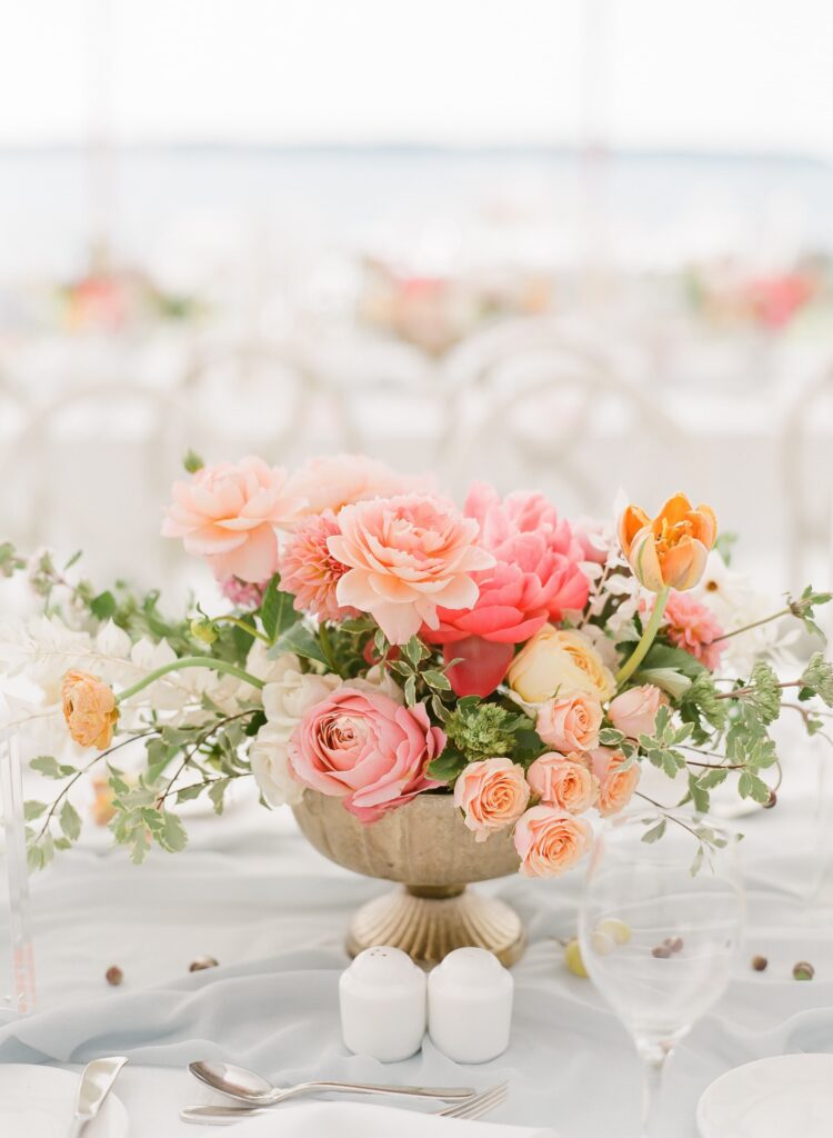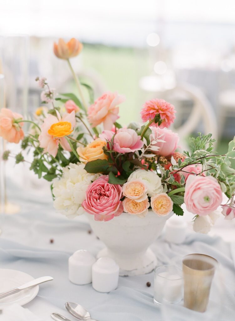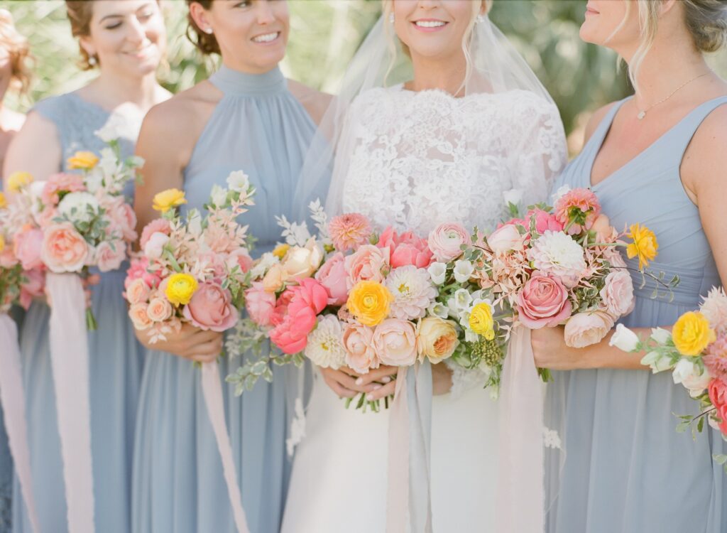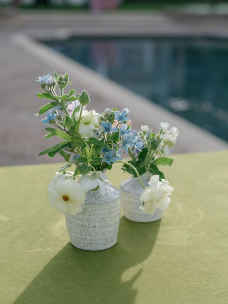 To create a seamless transition from the rehearsal dinner to the wedding day, we repurposed the florals from the previous evening. With a different color palette for the rehearsal dinner, we carefully incorporated pops of blue to harmonize the look and feel.