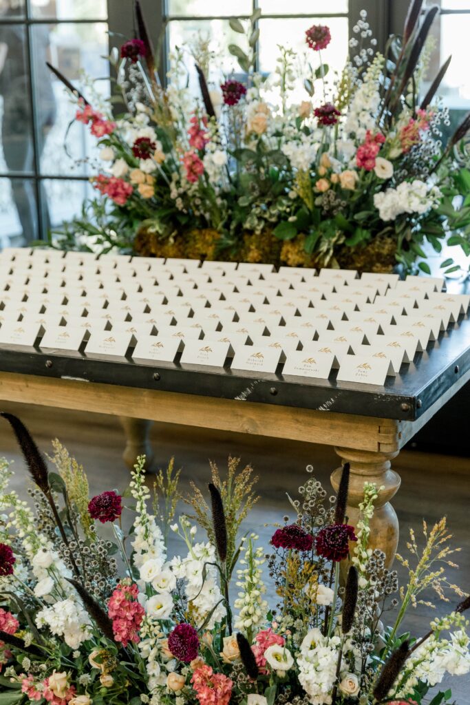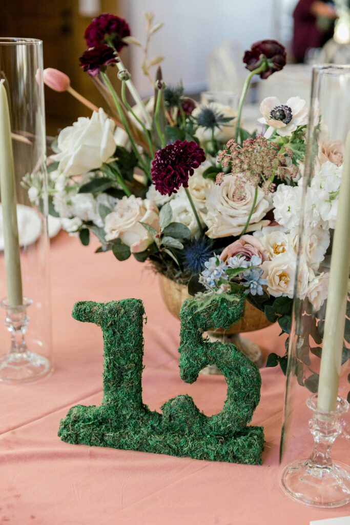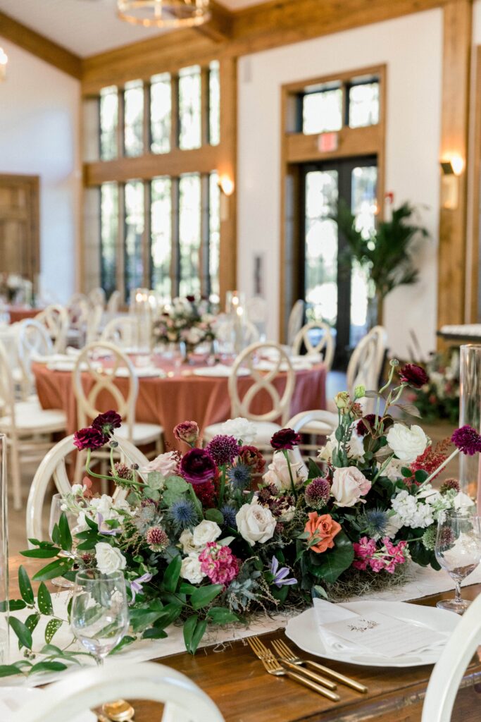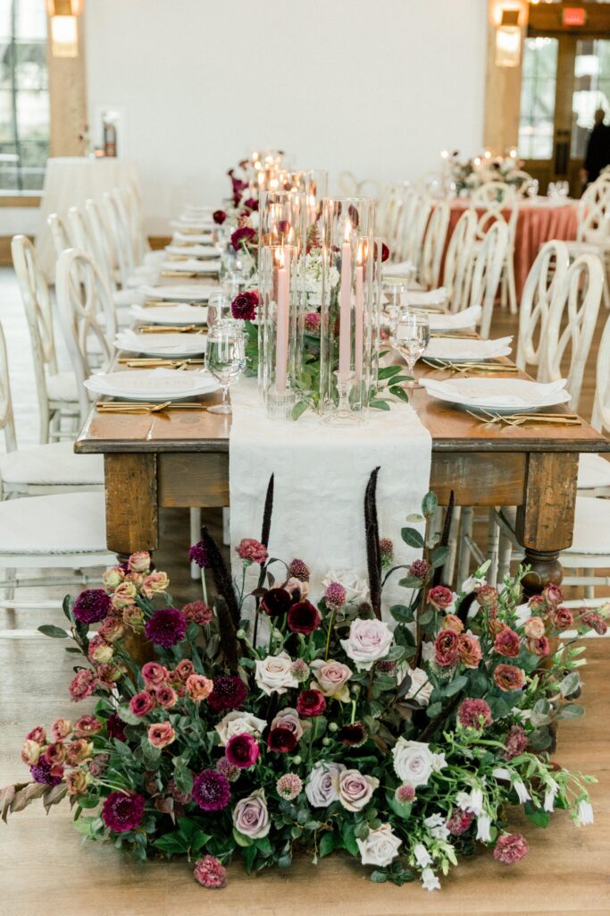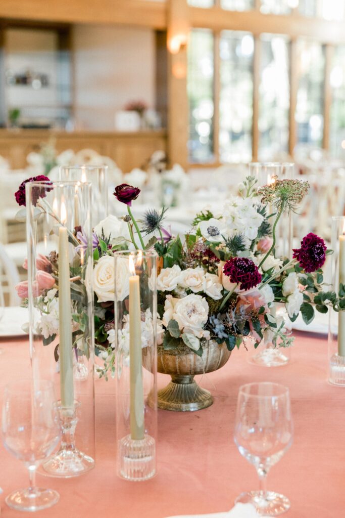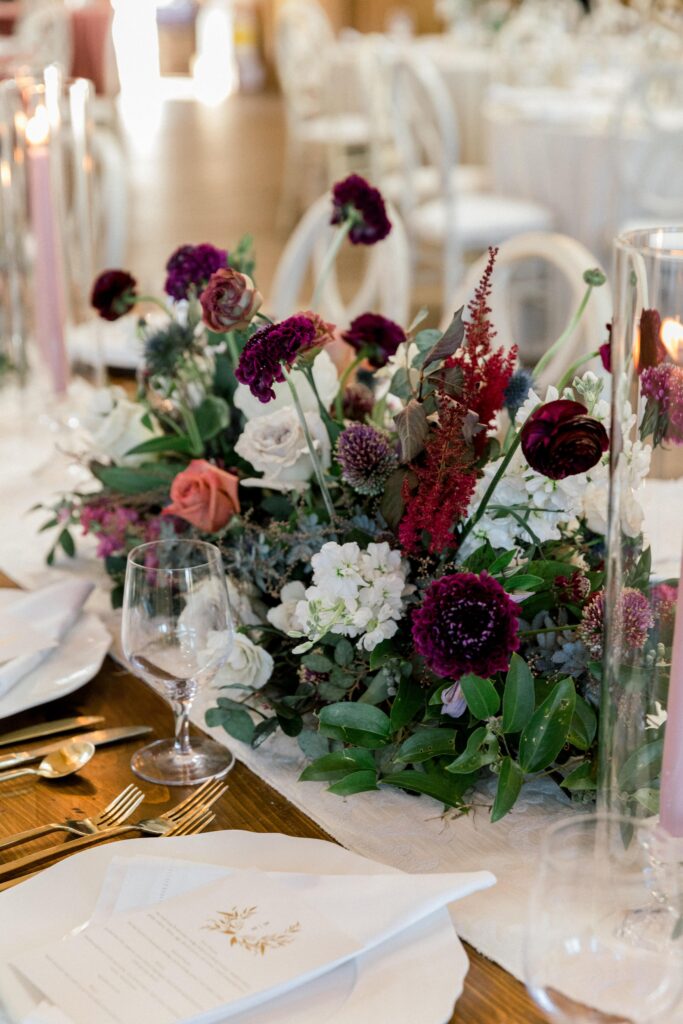 The focal point of this floral design was a color palette of romantic mauve blooms with pops of burgundy florals. In addition, we incorporated the bride’s favorite flower, white Delphiniums, into the aisle arrangements, which were later re-purposed in the reception space.