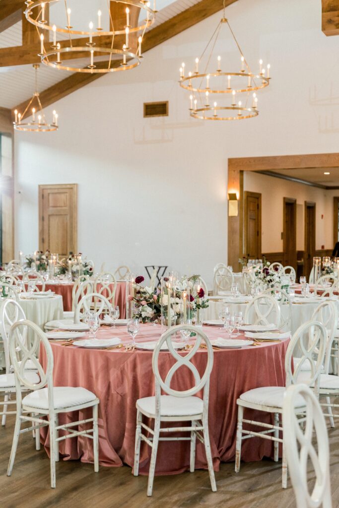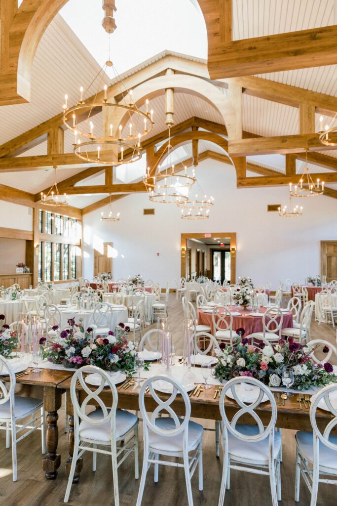 With indoor and outdoor event spaces to choose from, you truly can’t go wrong with this Georgia wedding venue. The outdoor area features immaculate lawns, open-air patios, and classic southern views. While the indoor spaces are truly exquisite. The indoor reception space is an elegant wood frame structure with crisp white walls and exposed wood accents. One of our favorite features in this venue is the breathtaking chandeliers in the ballroom. We can’t wait to bring these ceilings to life with beautiful blooms!