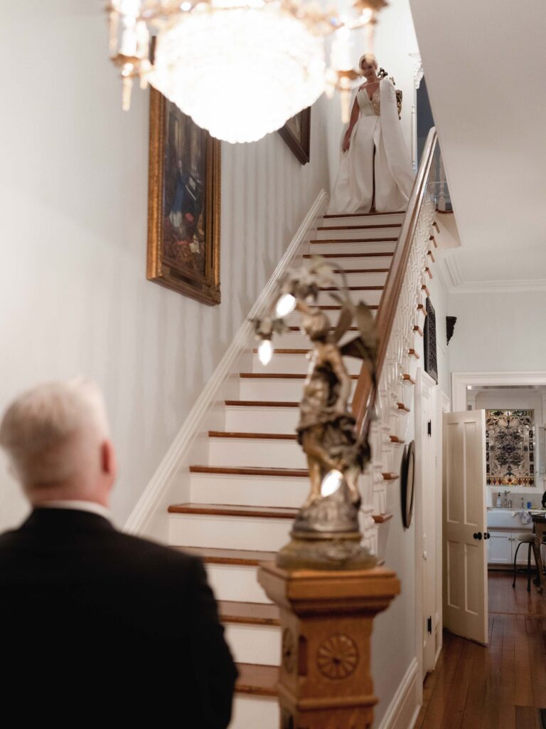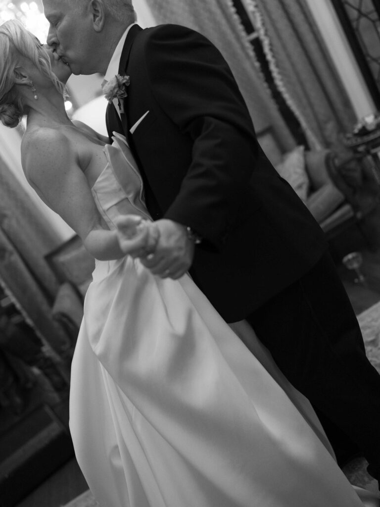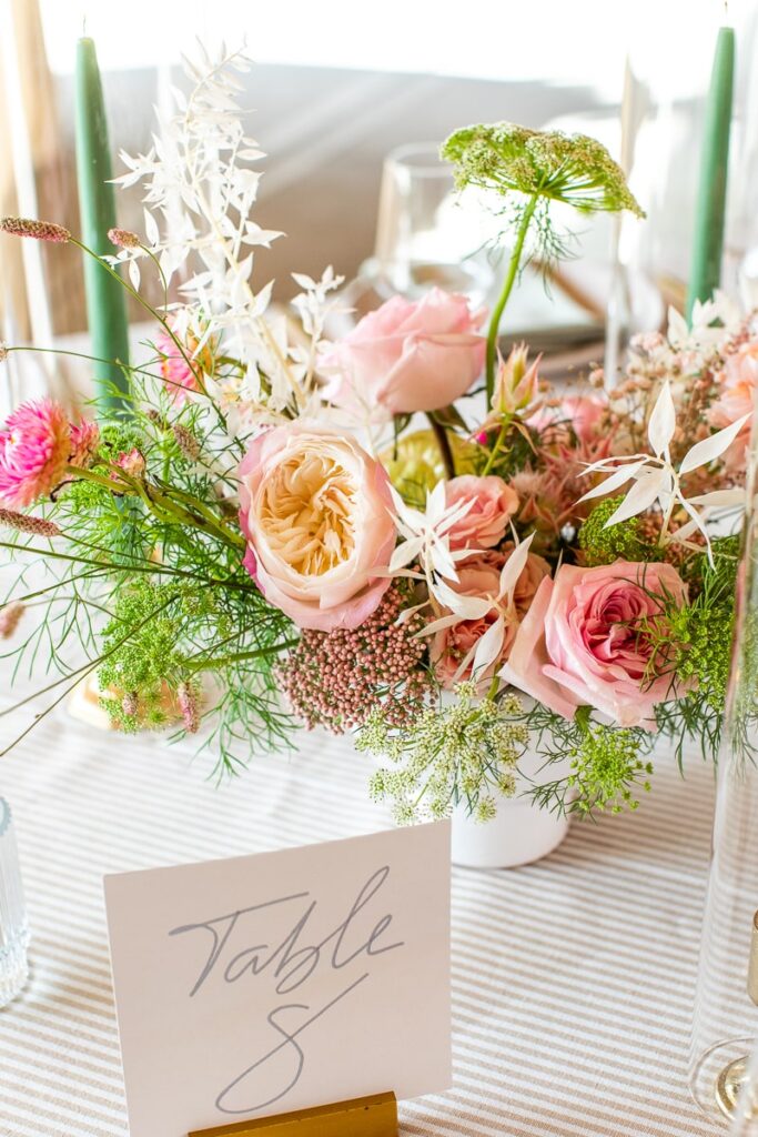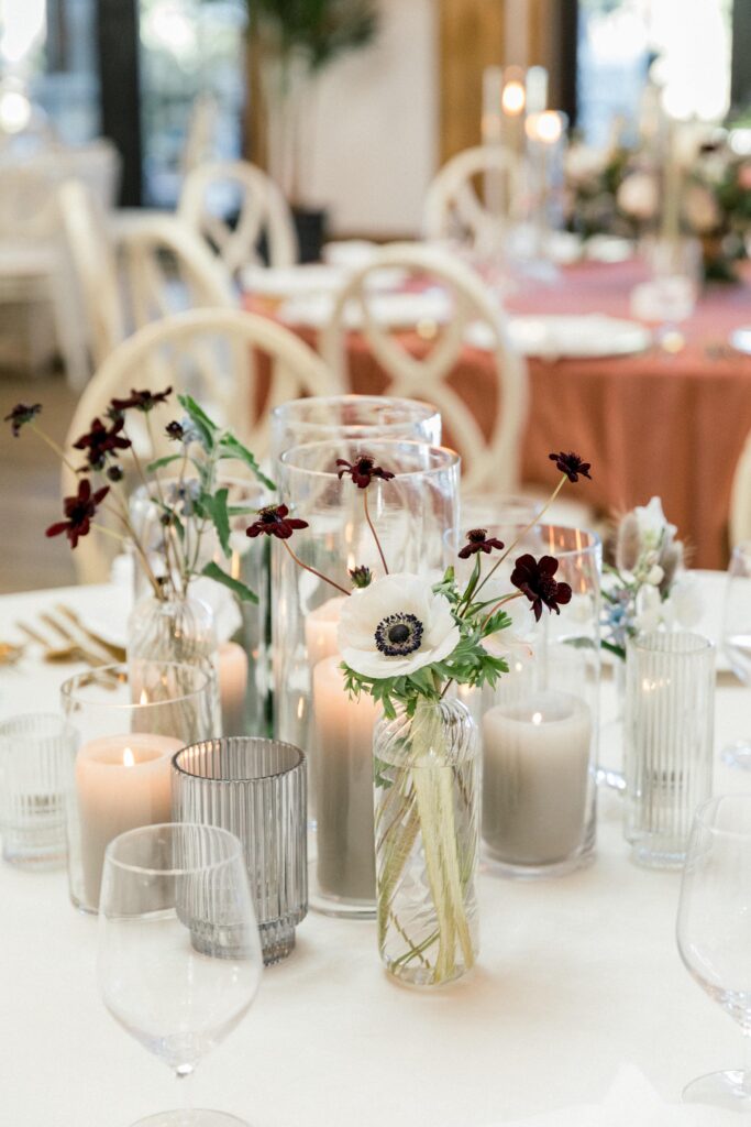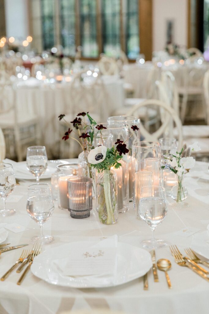 After the ceremony, guests headed indoors to the reception space for an elegant evening of dinner and dancing. For the guest tables, Emily Burton Designs went with a tasteful neutral design where the floral centerpieces were a focal point and were a warm pop of color. We opted for clean, classic, and crisp ivory tapered candles to not take any attention away from the romantic florals.
