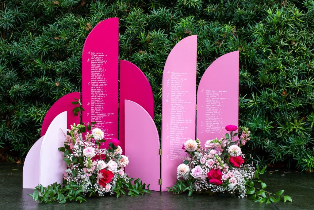 Deep burgundy tones were incorporated throughout the design, from the velvet bridesmaid dresses to the wedding day stationery. Even the groom’s outfit change featured a velvet burgundy jacket.