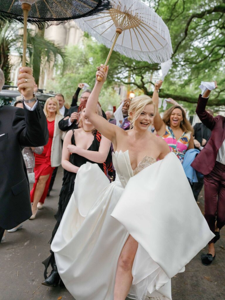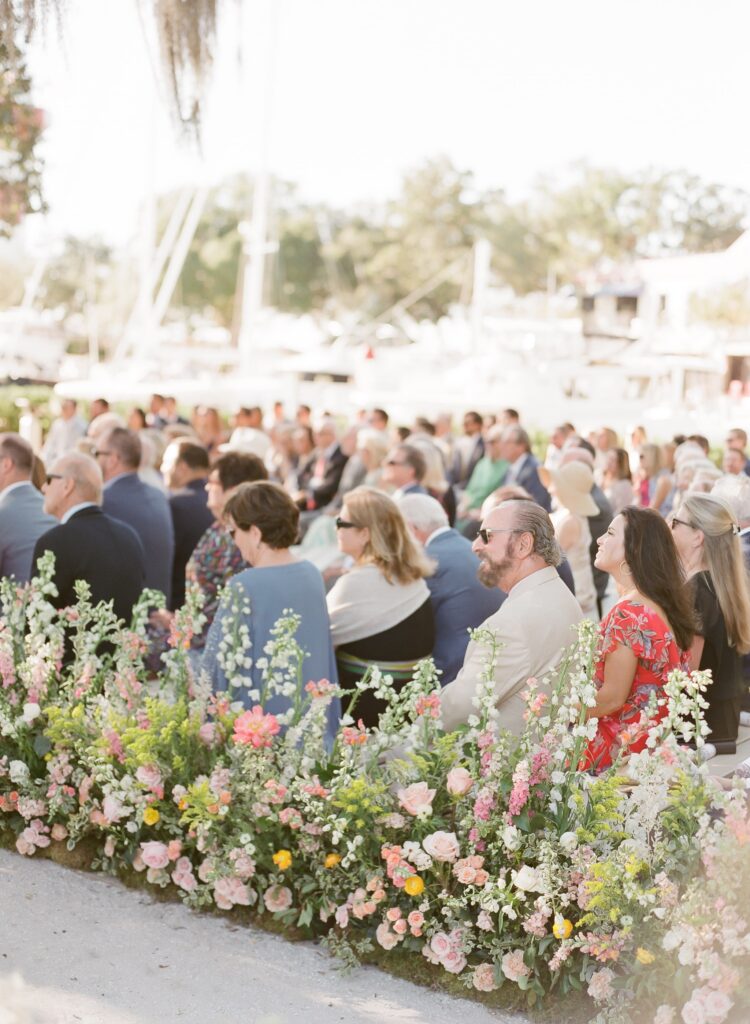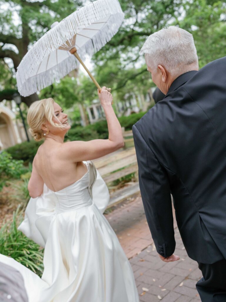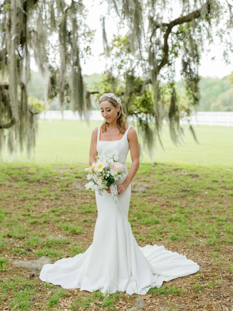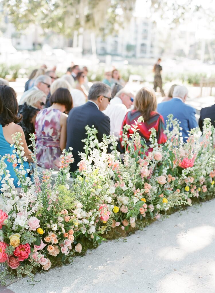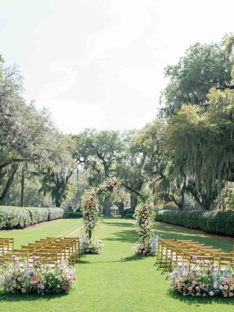 The day of the wedding was absolutely perfect. The weather was ideal, with a gentle breeze and clear blue skies. Joanna and Eric’s ceremony was a true Southern vision and took place under a majestic moss-draped Liberty Oak tree. The aisle was lined with colorful meadow arrangements filled with bright pinks, soft peaches, and pops of yellow.