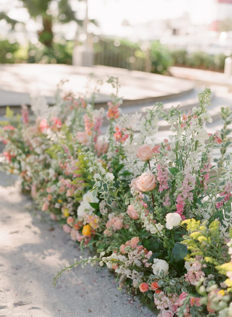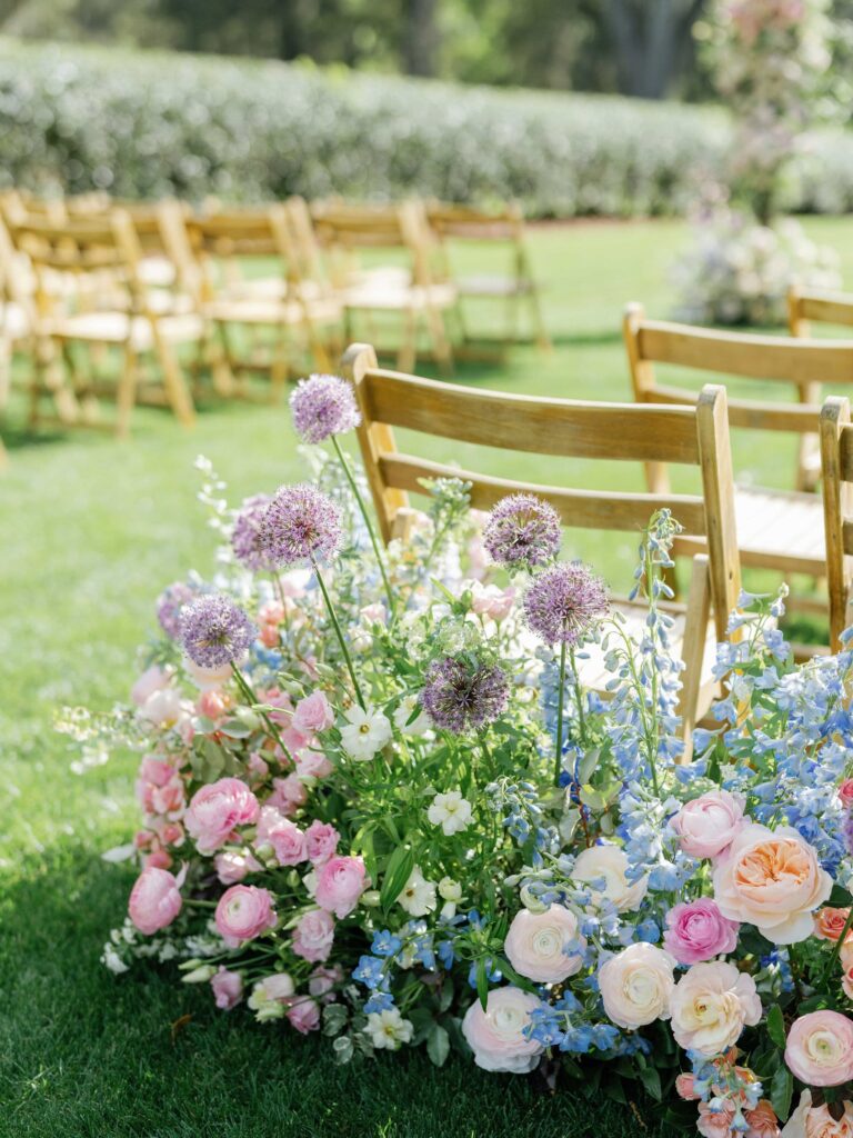 For the ceremony, we made a wooden a-frame wedding arch adorned with bursts of pastel-colored blooms. The entrance to the aisle was designed with similar blooms, and it felt like the ceremony was nestled amongst a lush garden. It was the perfect setting for a magical garden party wedding ceremony.