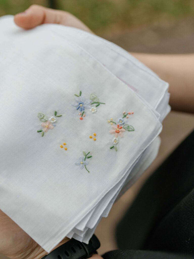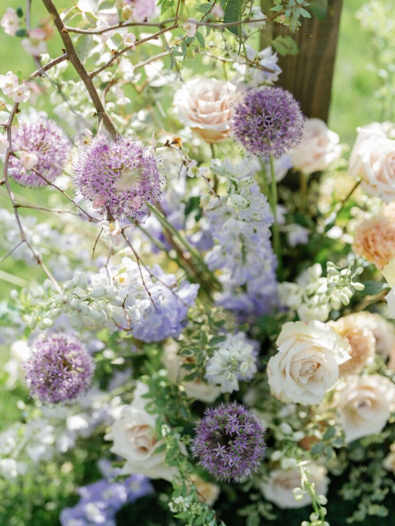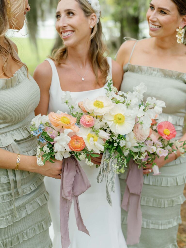 For her bouquet, we incorporated poppies, sweet peas, allium, ranunculus, spirea, and phlox together to create a light and ethereal design. Olivia’s bouquet was tied with a floral embroidered ribbon, while the bridesmaids carried similar petite bouquets tied with wide lilac-colored silk ribbon.