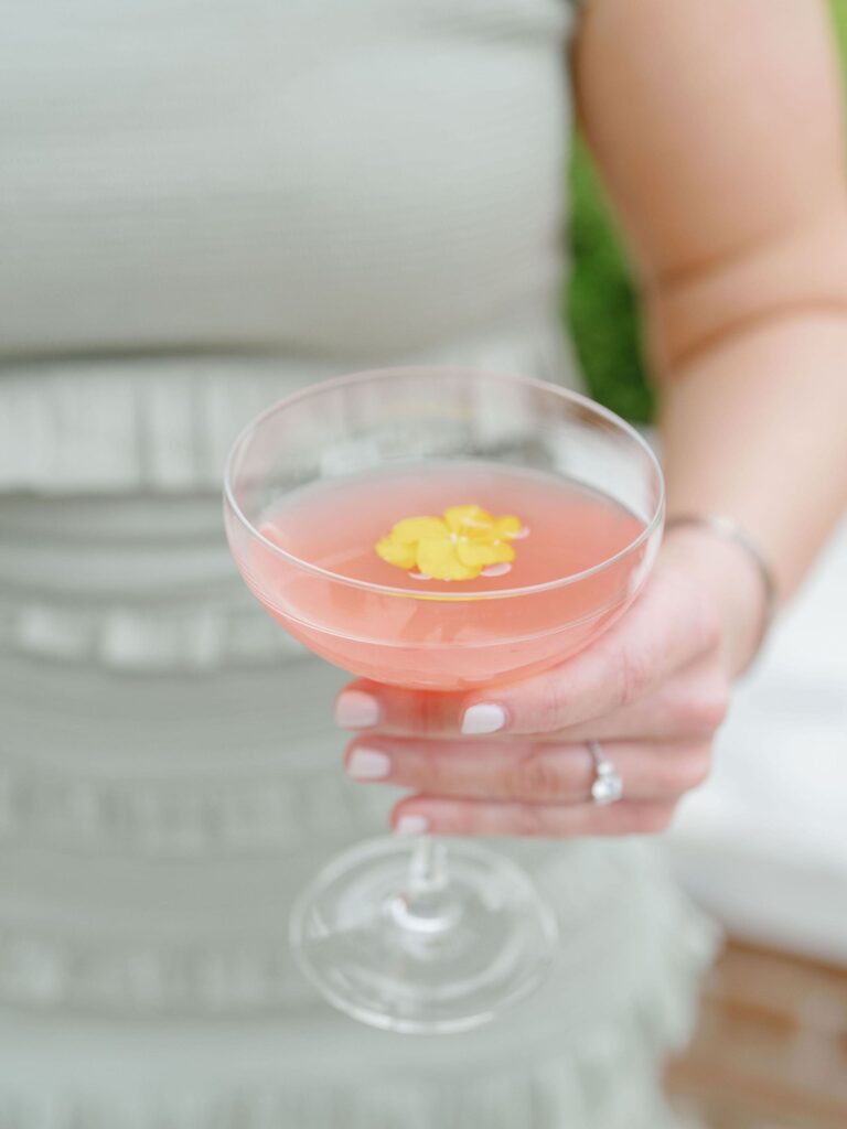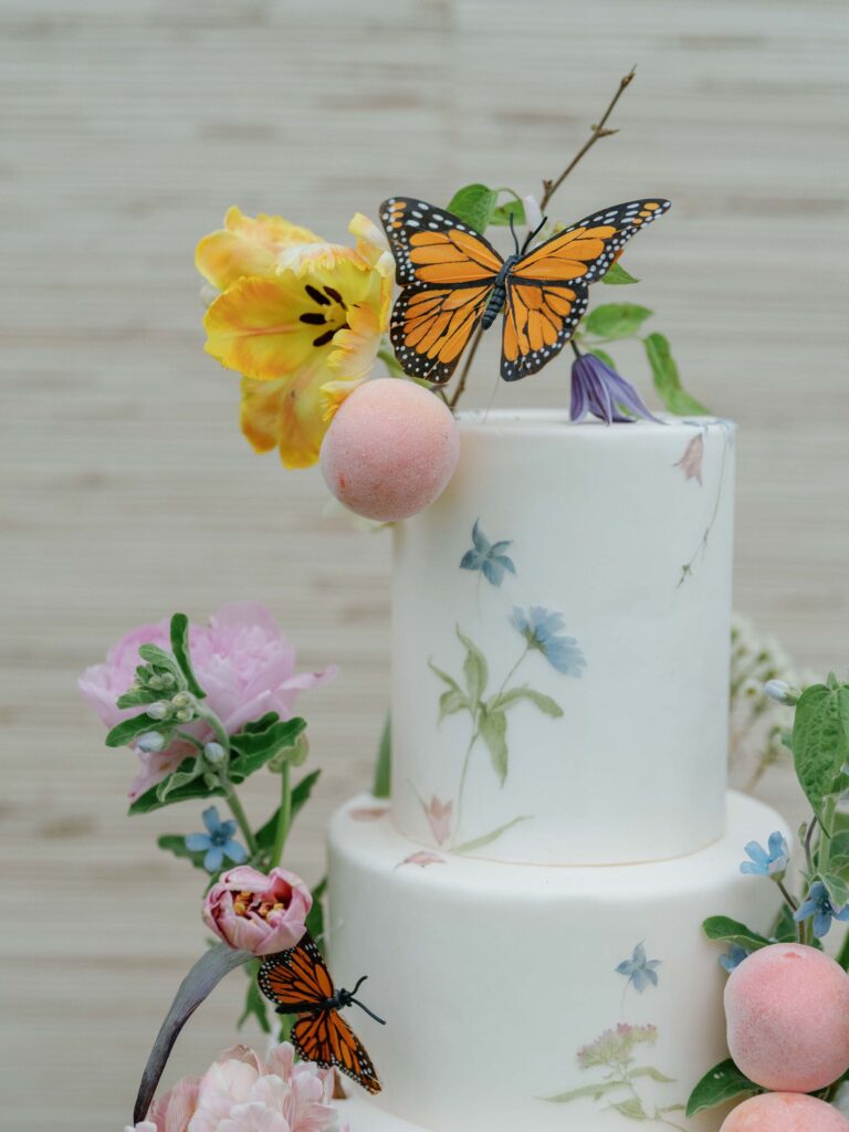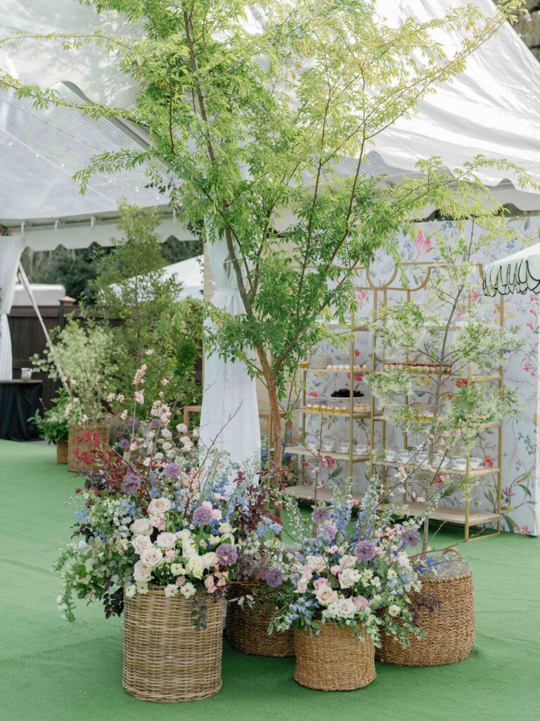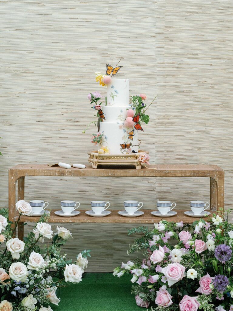 As the cocktail hour drew to an end, guests were invited inside a magical garden party wedding tent. At the entrance of the tent, guests were greeted by billowing baskets of blooms, lush Spring trees, and the cutest little bistro tables. Inside the tent, the reception bar featured two Dutch Master-style arrangements with tulips and hyacinths overflowing from the vase. Guest tables featured long arrangements with bountiful blooms in blush and pastel tones. Subtle yet delicate details, such as edible florals in the signature cocktails and butterflies on the cake, helped bring this garden party wedding reception to life.