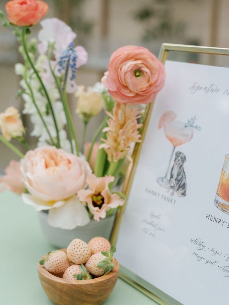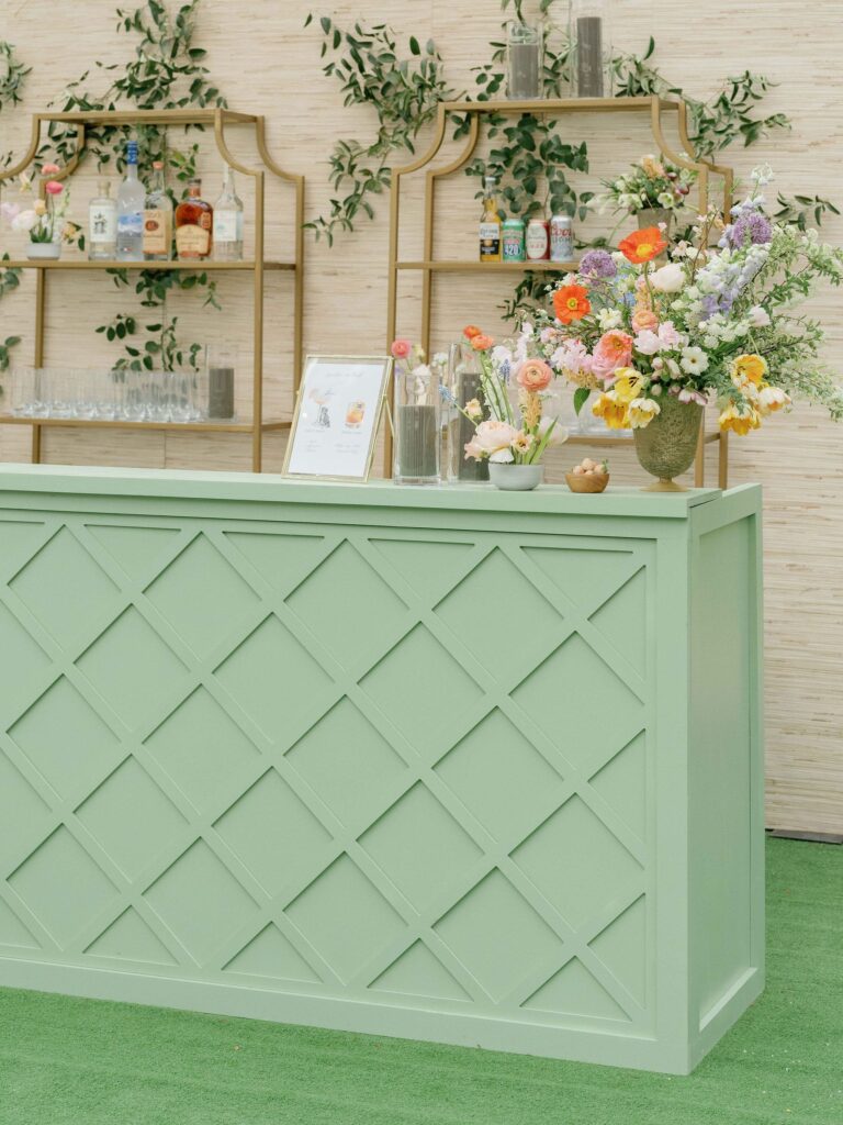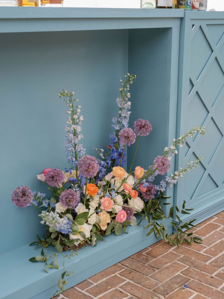 One of our favorite features of this garden party wedding design was the recessed bar at cocktail hour. For this feature, we placed vibrant Spring blooms inside the recessed window in the bar to create a true focal point for this portion of the reception. We especially loved the dancing purple allium flowers, which made this design element feel so playful.