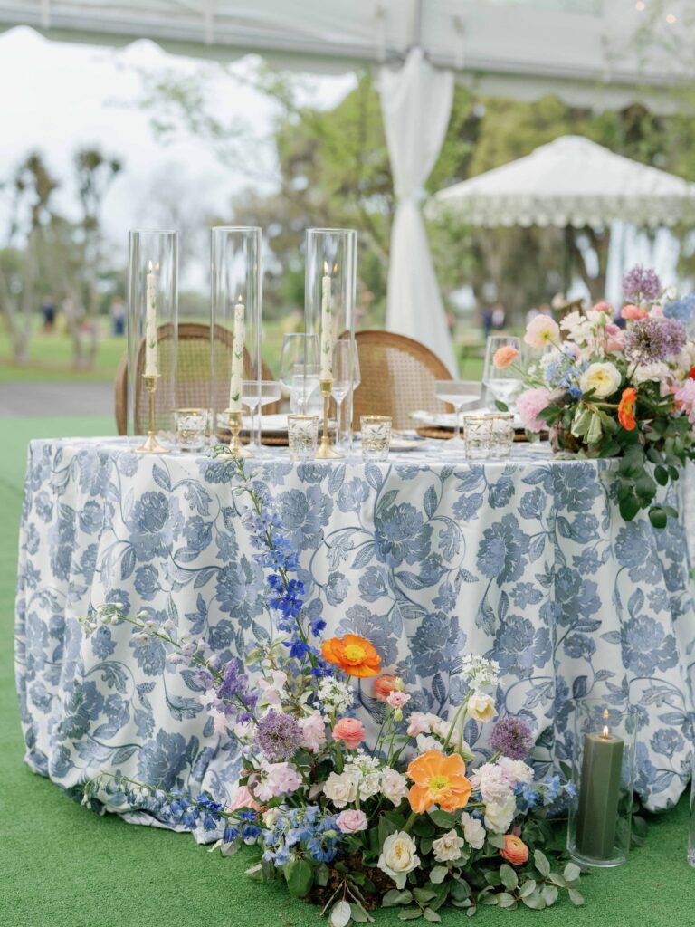 Working with Julia and Chase on their Jekyll Island Club tented wedding floral design was an absolute pleasure. We loved working with the less common color palette of blue blooms and how the design turned out!