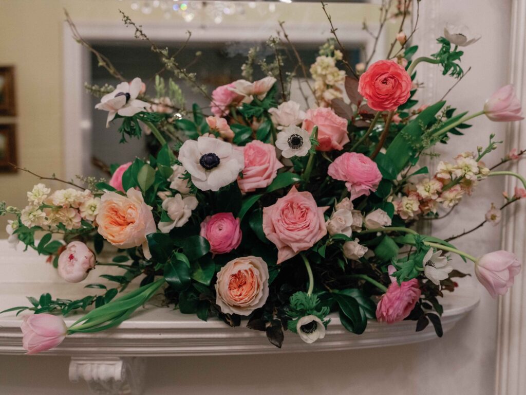 The selection of flowers for this grand occasion was nothing short of breathtaking. Roses, dahlias, tulips, and campanula added delicate layers of beauty, while stock, carnations, and Spanish moss provided textural depth to the arrangements. Delphinium, ranunculus, hellebore, and smilax effortlessly intertwined throughout.