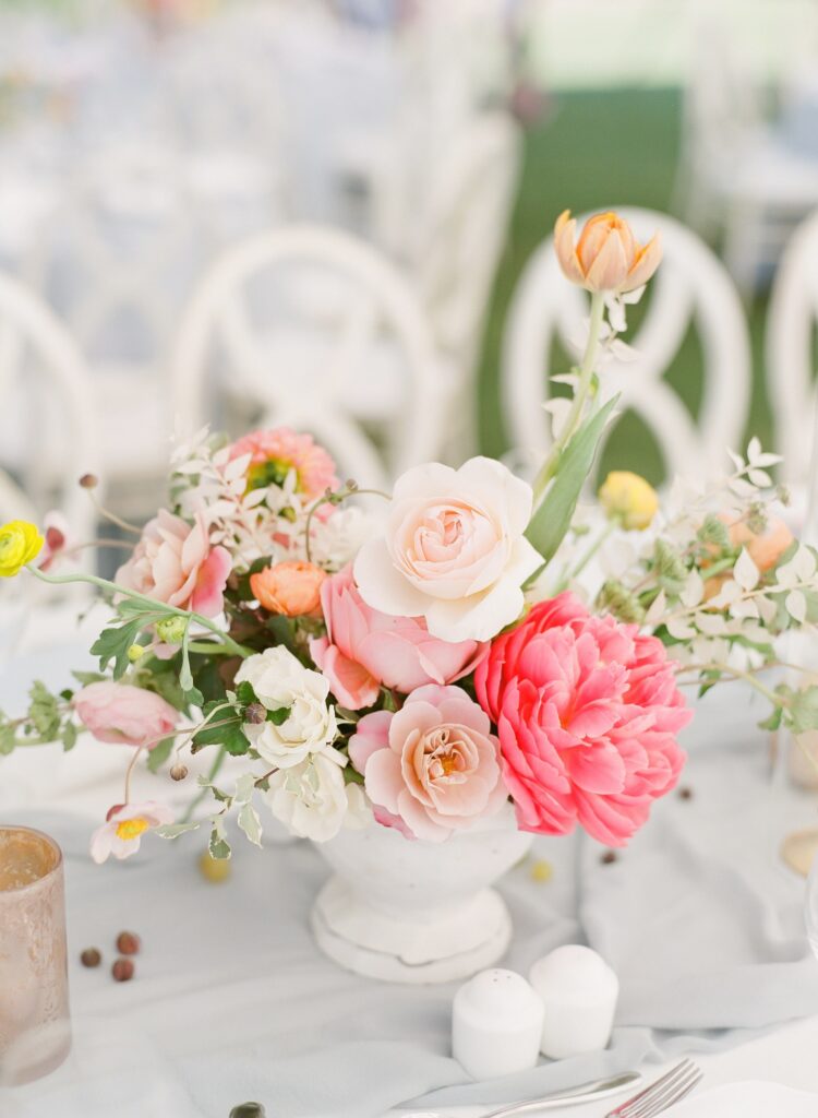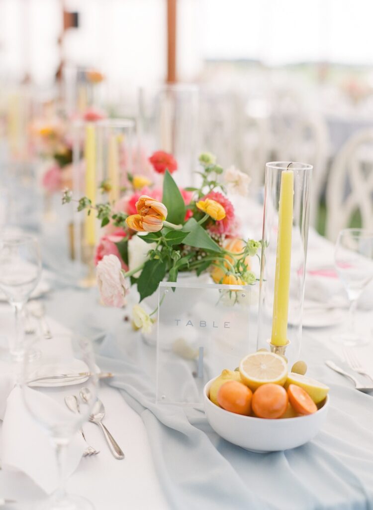 Each centerpiece and bouquet was meticulously crafted to reflect Joanna’s vision. The vibrant hues of pink, yellow, and orange danced harmoniously together, creating a joyful atmosphere that mirrored the couple’s love and happiness. For the centerpieces, we opted for a combination of white ceramic and rustic gold vases, which paired beautifully with the votive candles on the tables. Tall taper candles and fresh bowls of citrus fruits provided additional bursts of color on the guest tables.