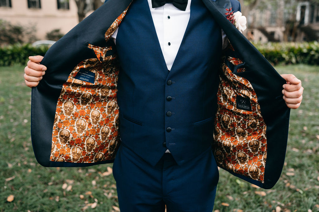 The couple picked The Liberty Oak for their ceremony, where a centuries-old moss-draped oak provided the perfect backdrop. Floral installations enhanced the gorgeous space and added the touch of bold jewel tones that Beth loves.
