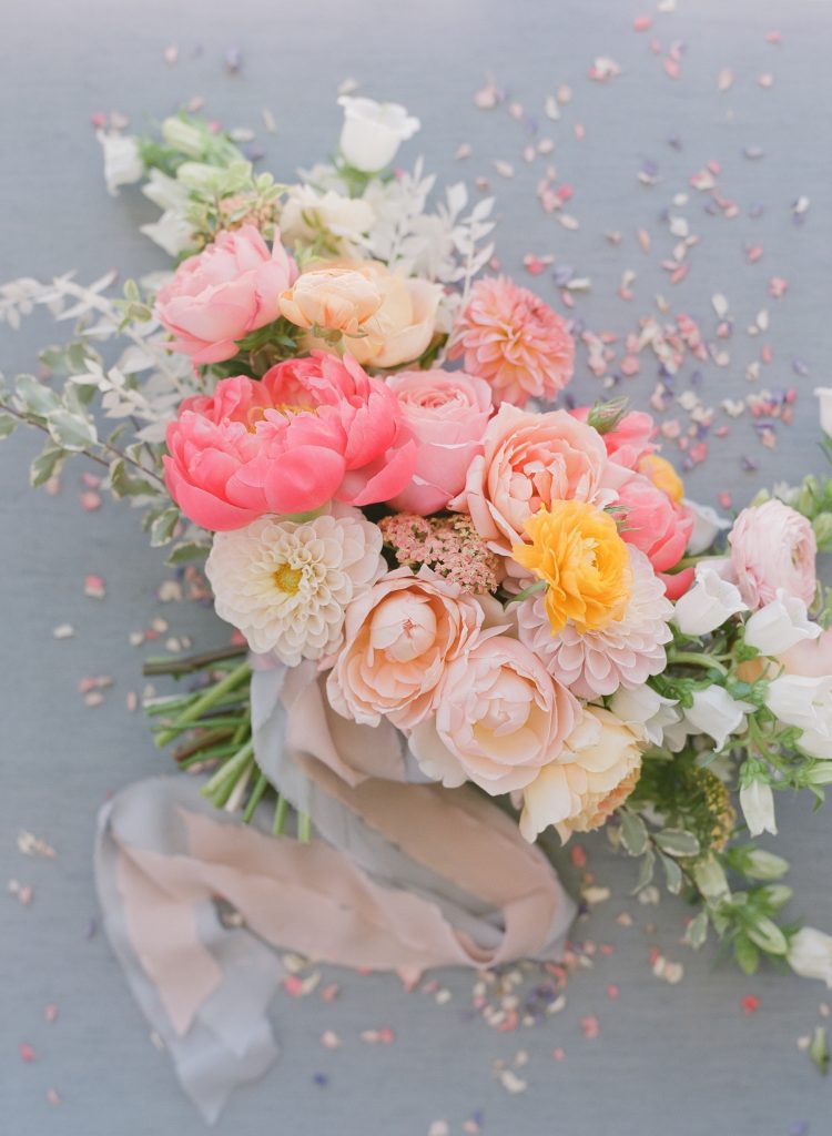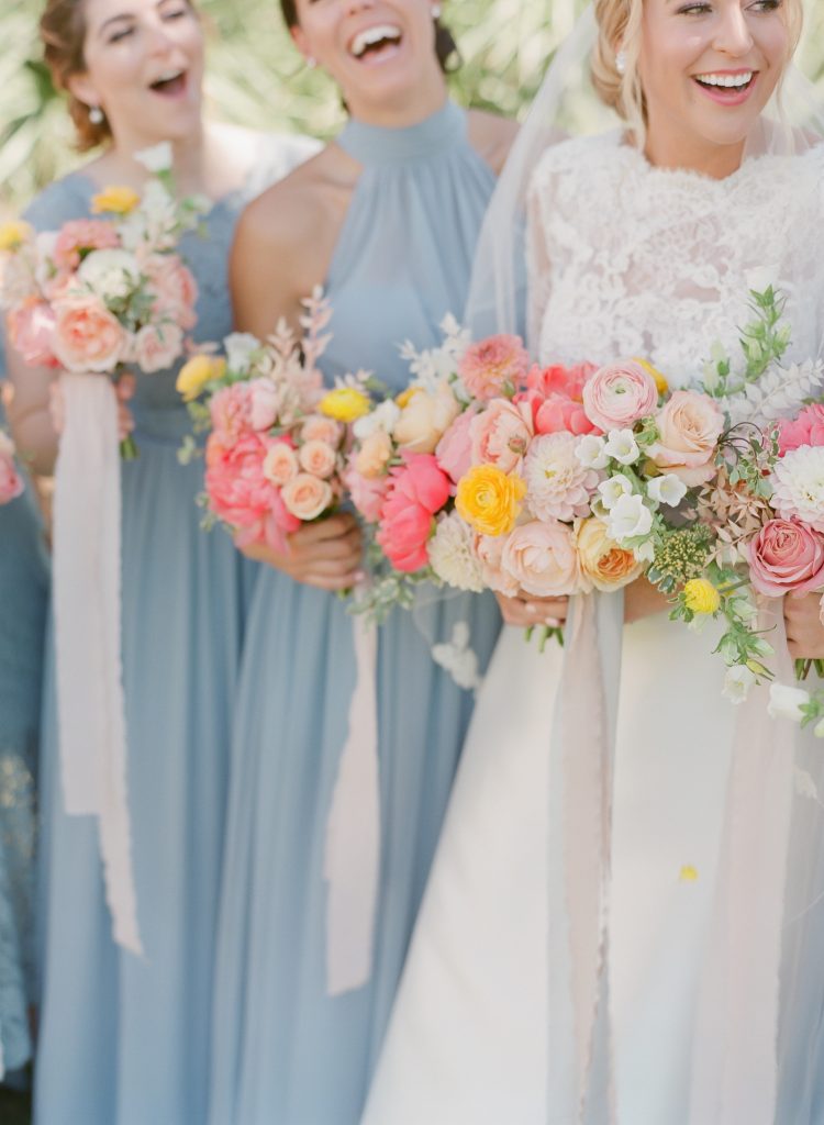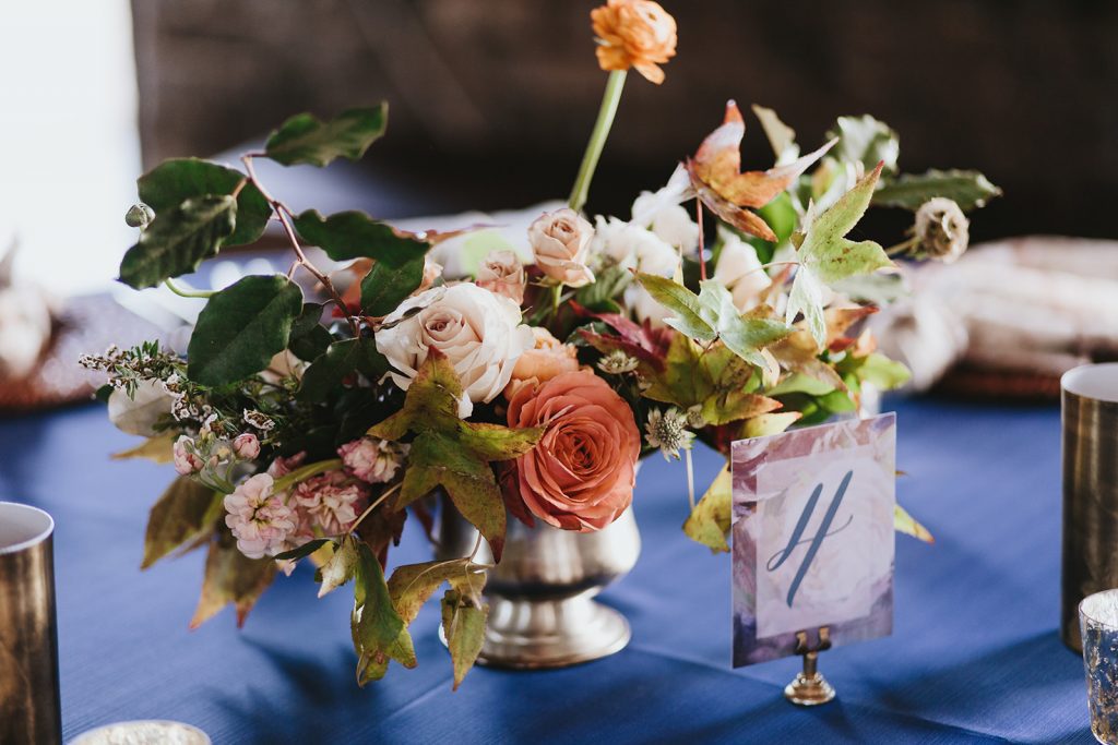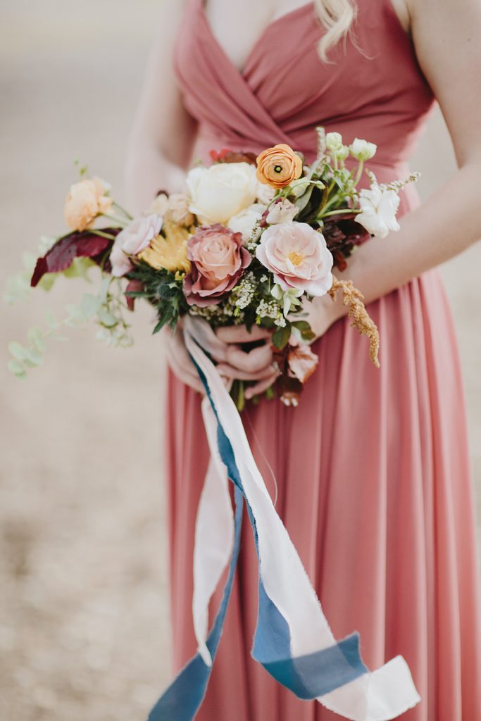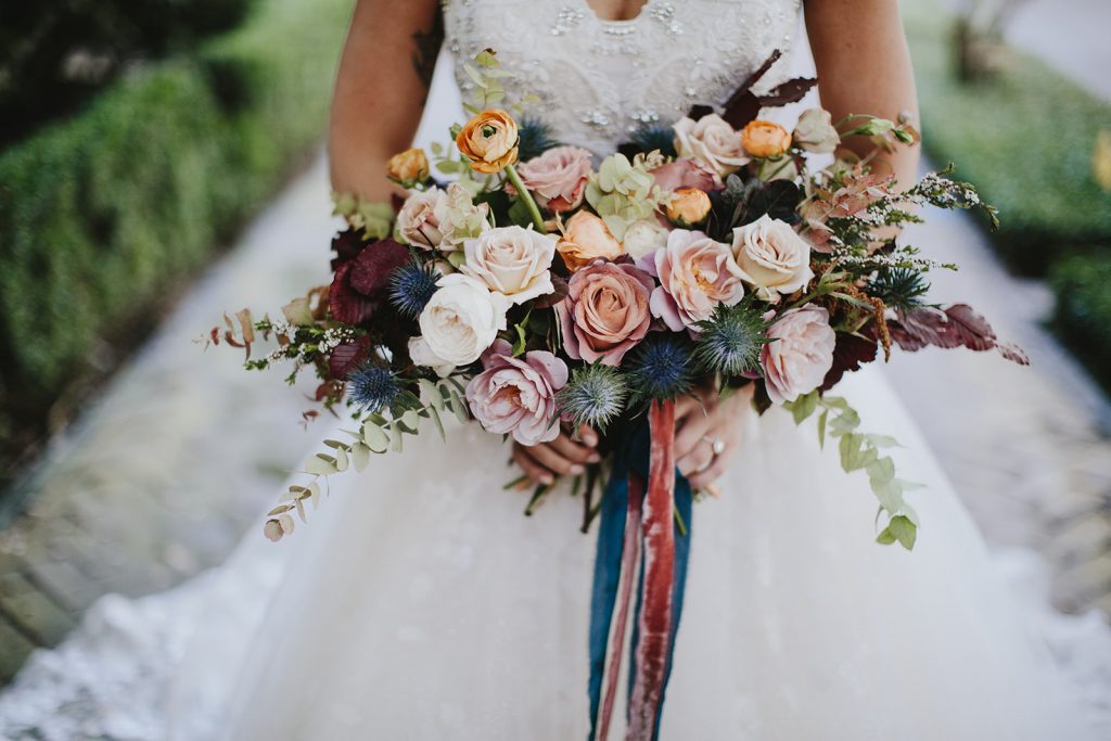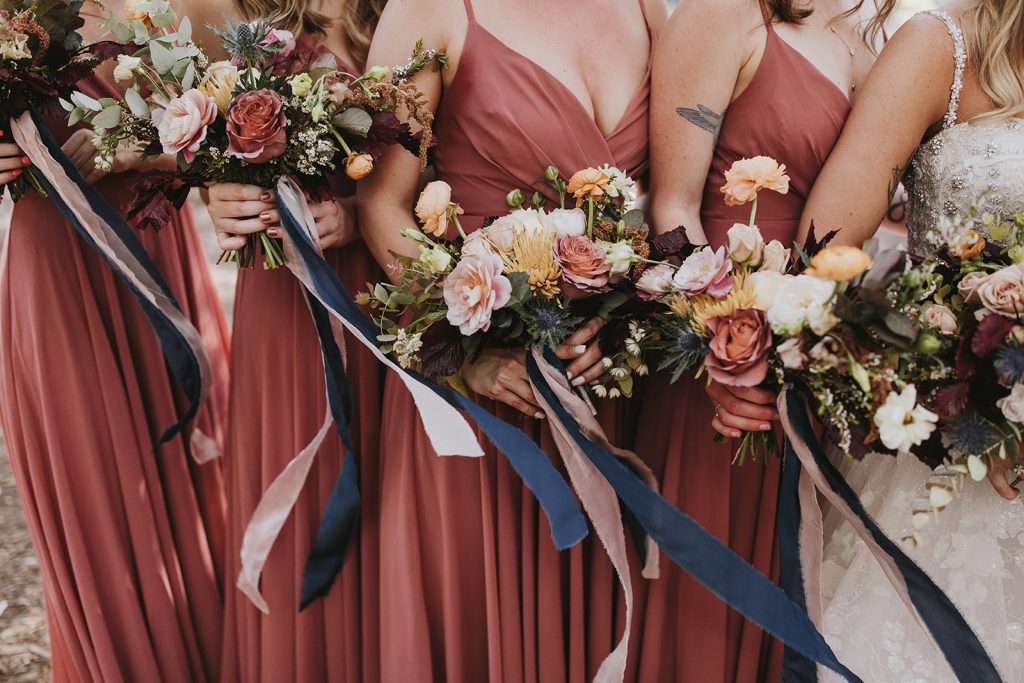 Kait wanted a lovely fall-toned wedding palette with soft creams, marigolds, rust, and mauve. We took color inspiration from her bridesmaids, who all wore gowns in various shades of blush and copper. Kait’s bouquet featured copper cymbidium orchids, tied loosely together with cream ranunculus, mauve roses, and handpicked flowers in shades of honey and blush.