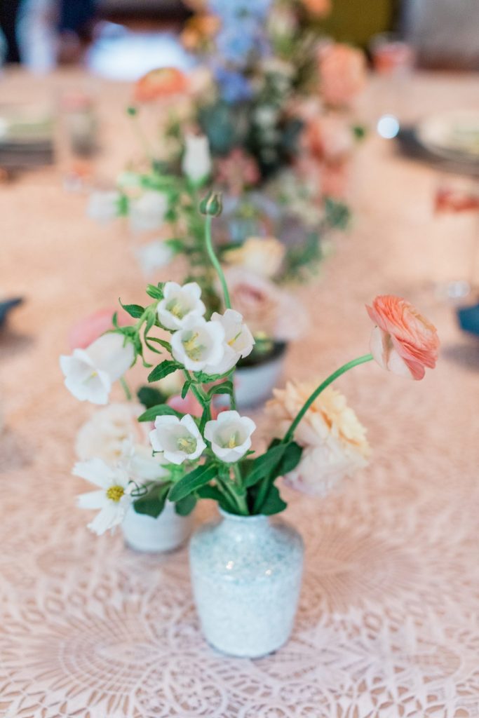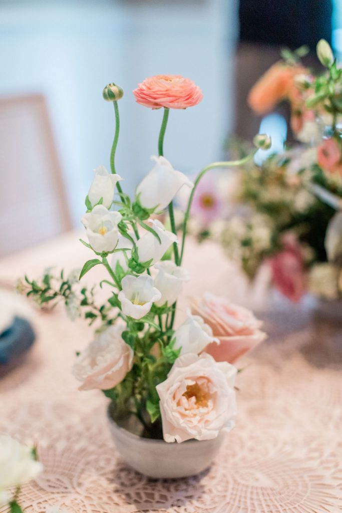 We like to place bouquets in a vase at the center of the table and then have six bud vases with blooms placed around them. That way it looks like a centerpiece and not like someone just plopped a bouquet down on a table.