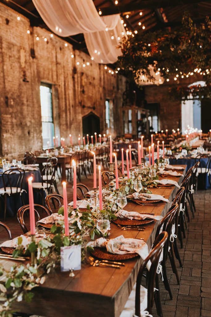 They chose to have their ceremony outdoors in the sunken garden, which provided guests with a picturesque view. Since this space is already gorgeous, we kept the ceremony decor simple, with pampas, grass, and candles to make the area romantic. The couple incorporated a Celtic handfasting tradition into their ceremony to honor their Irish and Scottish heritage. They chose meaningful cords, including a guitar string from Eric’s first guitar and a ribbon from Kait’s first ballet slipper. It was such a touching moment and so meaningful for both families.