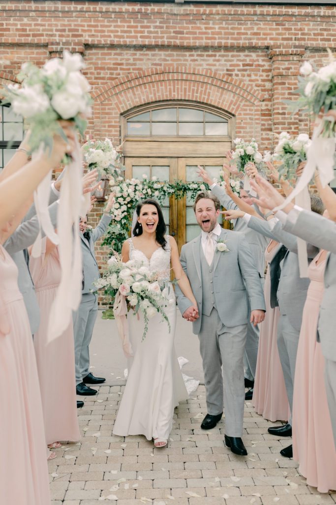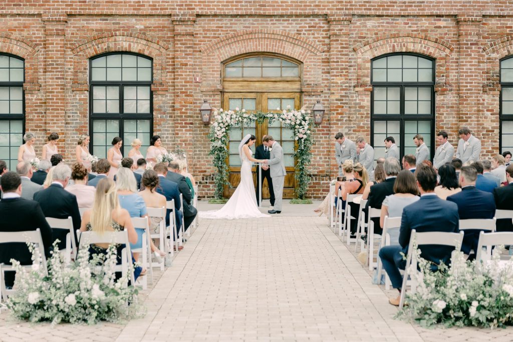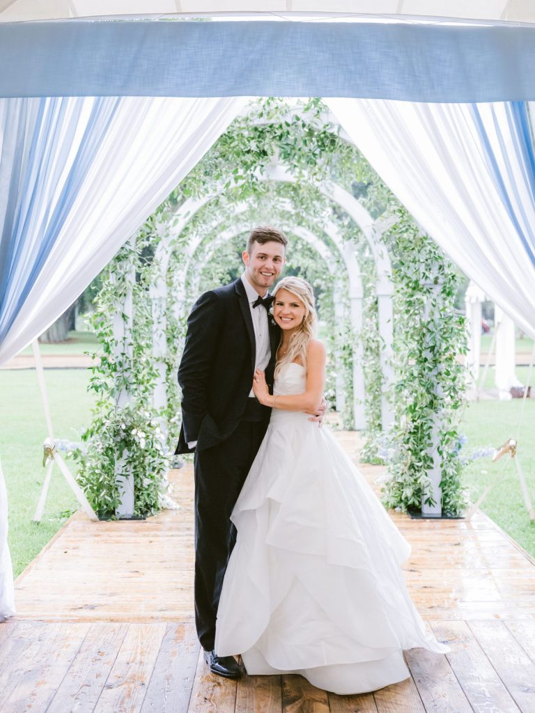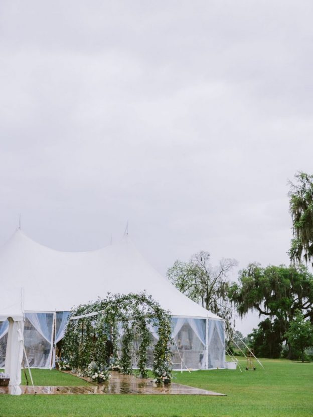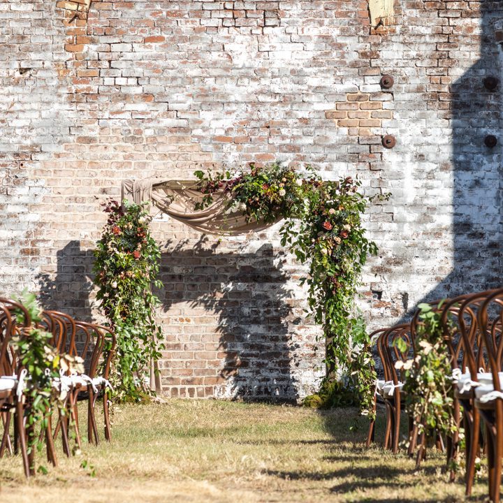 Tracy and Charlie were initially supposed to be married at Victory North, but the pandemic forced them to switch venues to Charlie’s family home on the water in Savannah. While it was a different location, it worked out flawlessly. The ceremony took place overlooking the water, with the most beautiful sunset that popped out after a day of rain. The ceremony arch was a statement piece! It was covered in flowers, with draping ivy and greenery that was tied into the reception.