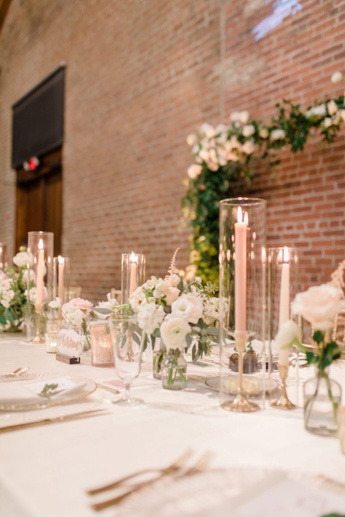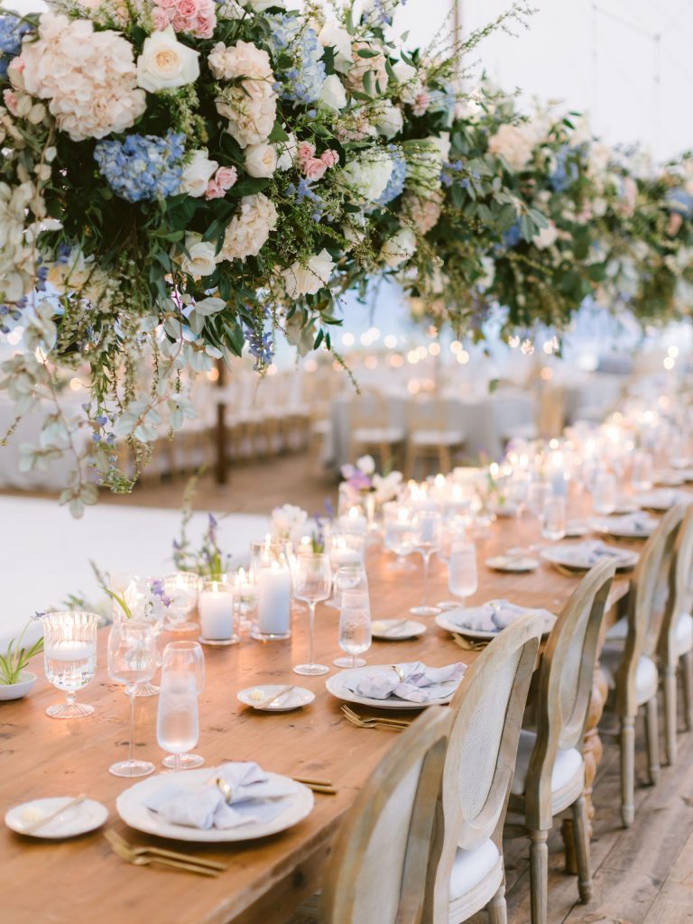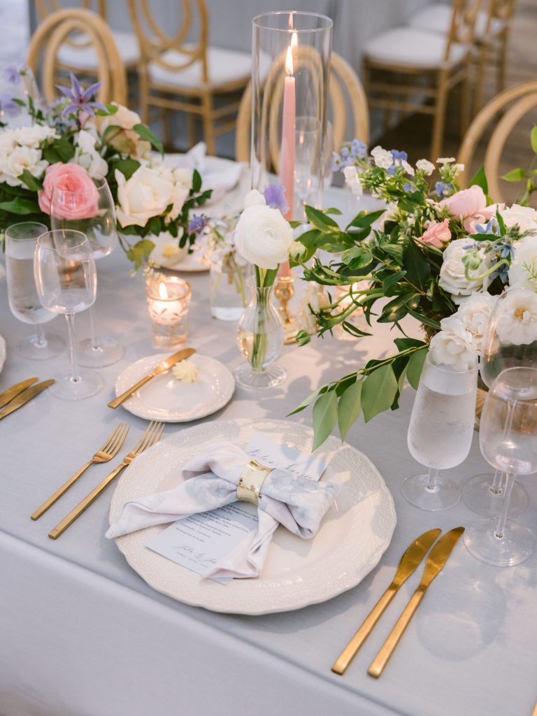 Classic blue and ivory linens highlighted the venue’s tropical elements and paired perfectly with the floral design. We brought in the most beautiful cashmere-colored candles that glistened amongst the blooms for the guest’s tables.