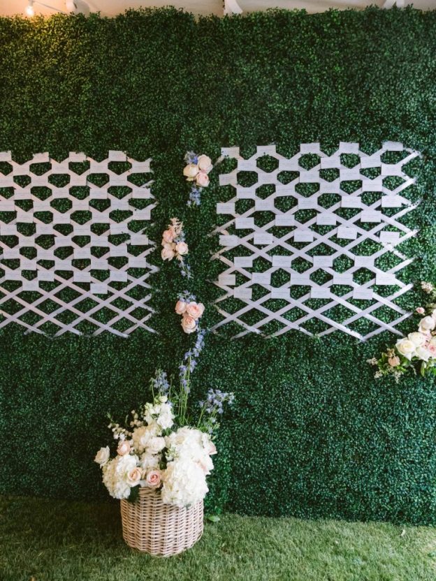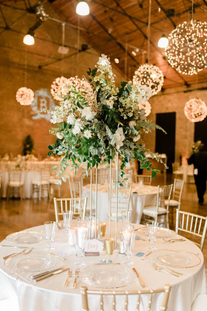 Inside the hotel, the classic white and green garden-inspired wedding design continued. Our team designed luxurious tall wedding centerpieces that were elevated above the guest’s tables, while we also re-purposed the aisle arrangements in front of the stage where they looked right at home. With a room filled with beautiful blooms, overhead guests were drawn to the beauty of the room and the garden-inspired wedding design that was featured throughout.