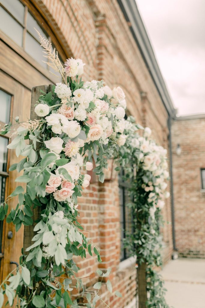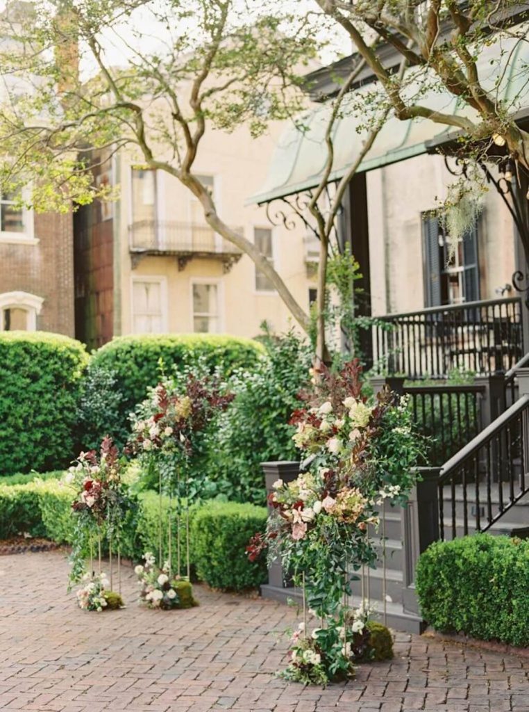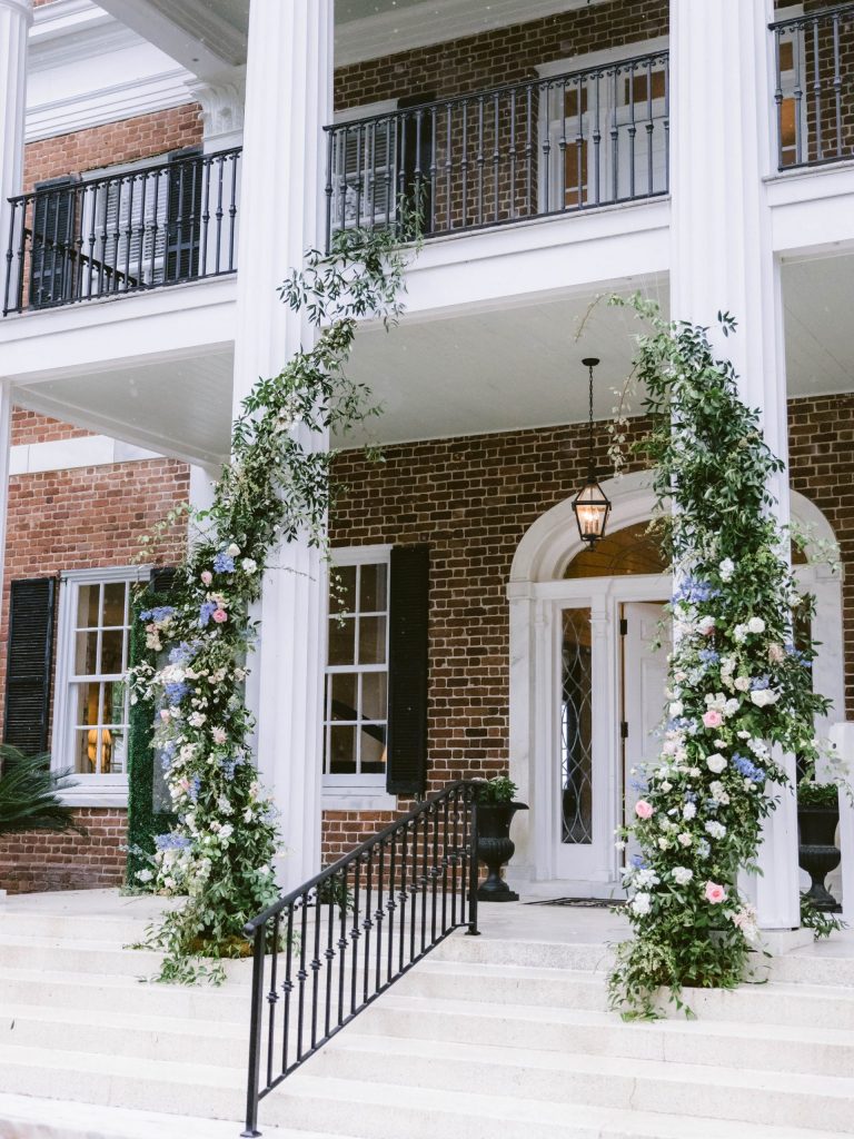 Their ceremony took place at the Cathedral Basilica of St. John the Baptist, one of the most iconic spots in Historic Savannah. We couldn’t add a floral arch to the cathedral’s front entrance, so instead, we created loosely twisted (and poetically romantic) stairwell garlands.