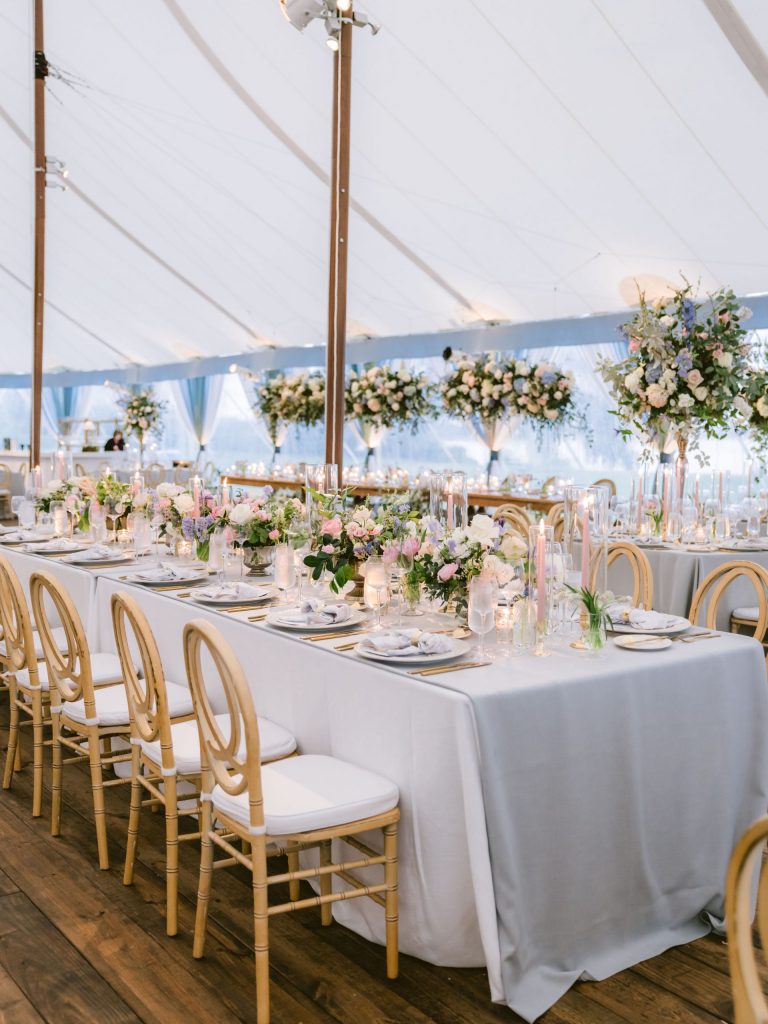 But in the end, our stunning couple was surrounded by all of their family and friends as they tied the knot at St. John’s Cathedral in downtown Savannah, GA, and celebrated their new marriage at The Ford Field and River Club in Richmond Hill, GA. Guests celebrated under white sailcloth event tents and each area of the celebration burst with beautiful spring flowers from the entrance of the venue to the dance floor. The Gray Harper Florals team transformed each space for guests to experience as they danced the night away – check out our designs below!