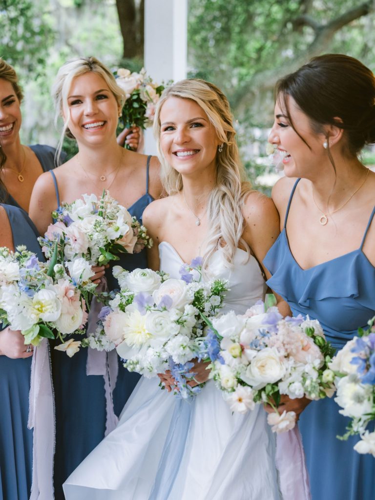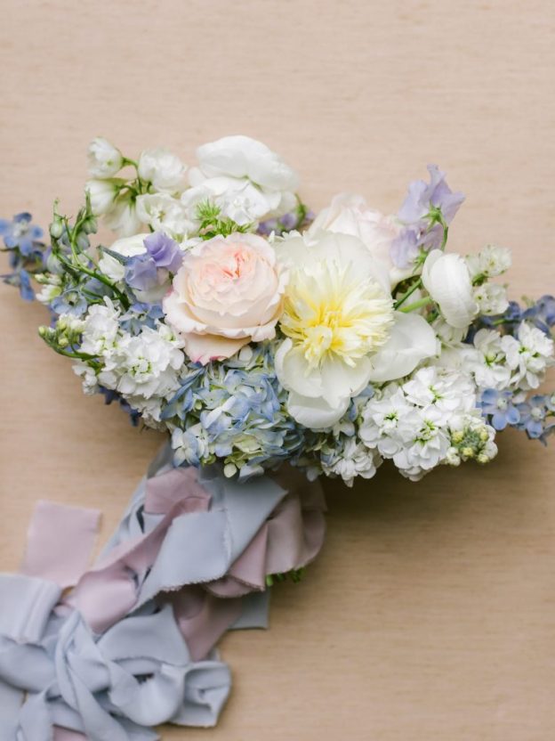 Large peonies were the focal point of Rachel’s bouquet, and a delicate touch of anemones and garden roses were tied together with greenery for an organic shape. Delphinium added the classic blue hue, which tied into the bridesmaid’s gowns.