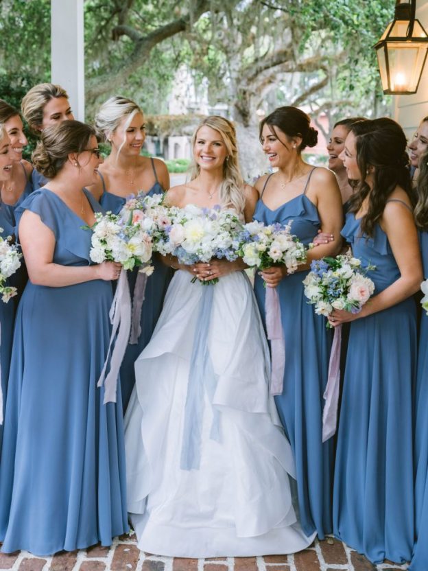 For their design, our team took inspiration from Kelley and Watts’s simple yet classic taste and blended it with tropical elements that complemented the surrounding foliage of St. Simons Island. Florals with soft blue tones were paired with peach blooms. Pops of orange and mustard were incorporated into the design to give it a fun and exciting twist on tradition. Tropical greenery was infused throughout with preserved palms and dried florals to provide the floral design with a relaxed feel.