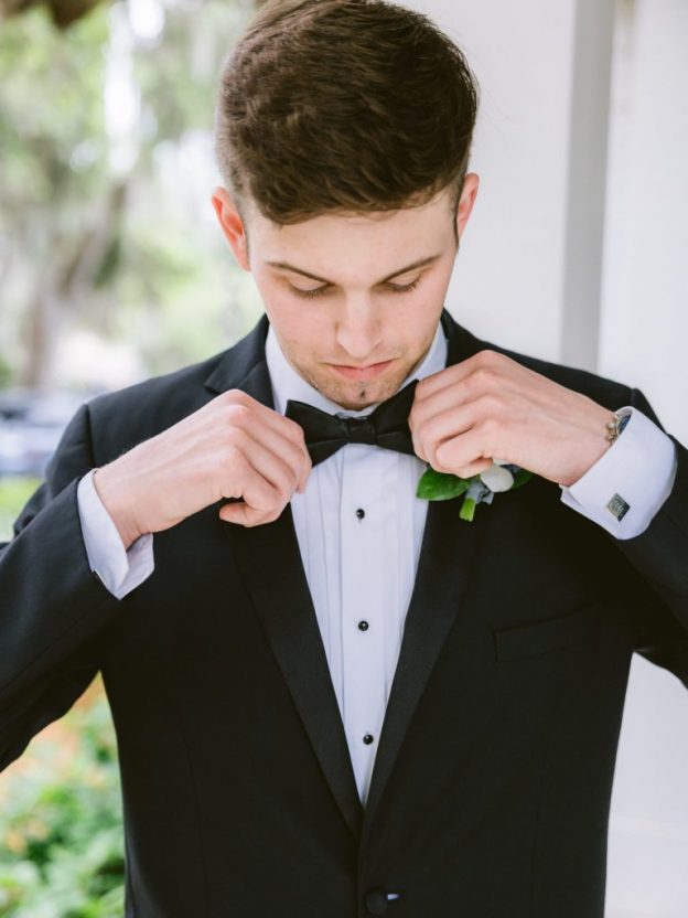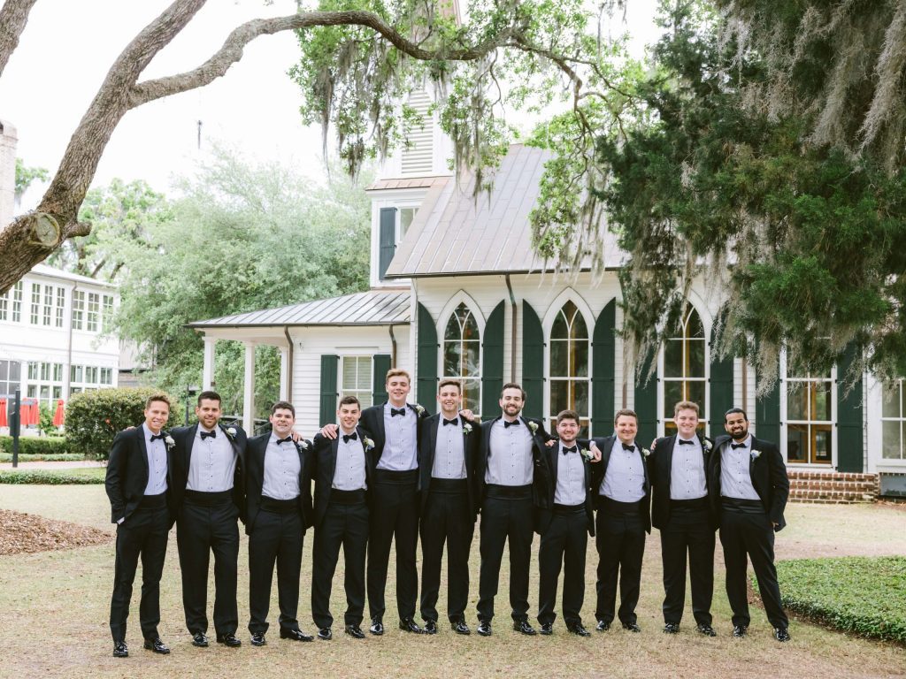 Our bride, Kelley, had a vision of all-white florals with a dash of tropical elements on her Sea Island wedding day. So, the Gray Harper team created a floral design with lush white blooms and lots of greenery. For the bridal party, we blended ferns and orchids with all white flowers to create green and white wedding bouquets. The bridesmaids and bridal bouquets were filled with texture-rich white blooms like Stock flowers, Hellebore, Phalaenopsis Orchids and Anthurium. While the groom’s and groomsmen’s boutonnieres were made with white mini Cymbidium Orchids.