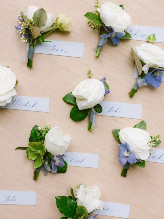 To continue with this all-white classic floral design, white bouquets and boutonnieres were created for each member of the wedding party. For the bridesmaid’s bouquets, we designed each with a single flower type of different white blooms. We loved this idea because it emphasized how each bridesmaid is part of the group but also different. We did the same thing with the groomsmen boutonnieres, designing each with a different white focal bloom. This was a beautiful way to honor the unique and special relationships Amir and Bess have with their wedding party members.