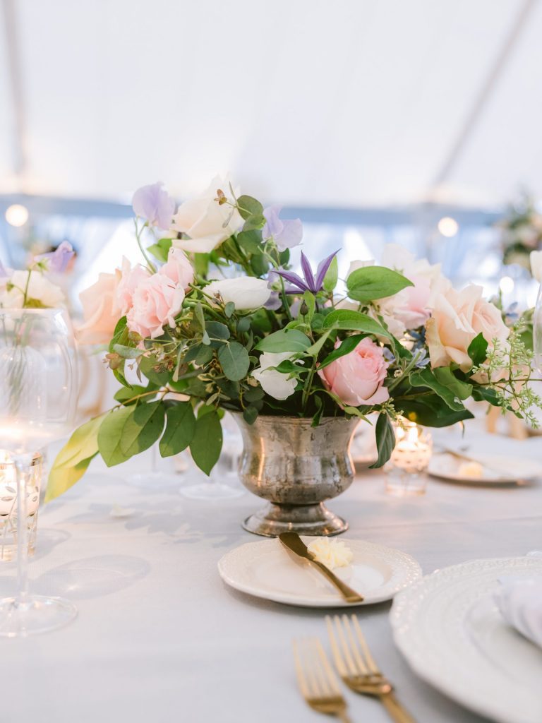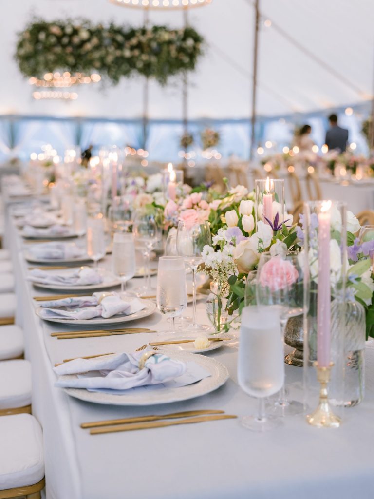 Since the reception took place on the family’s property, we wanted to make sure the tent was exceptional. The large clear tent provided the guests with cover from the rain, while the strung lights and endless candles provided the softest glow. We hung greenery across the ceiling and created a focal point as guests walked inside. The tables were a mix of large farm tables with rounds, which made an intimate setting. The farm tables featured copper candlestick holders with cream candles. Clear bud vases and gold mercury glass added metallic touches to the reception and bar.