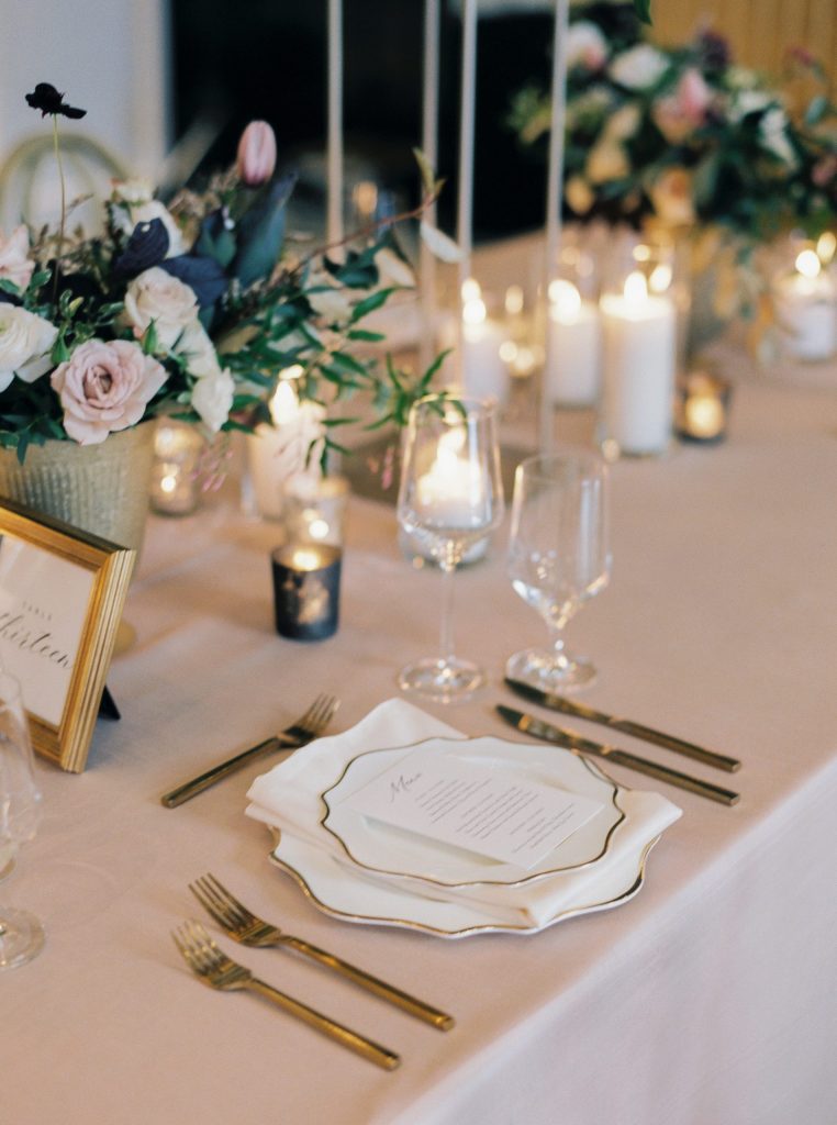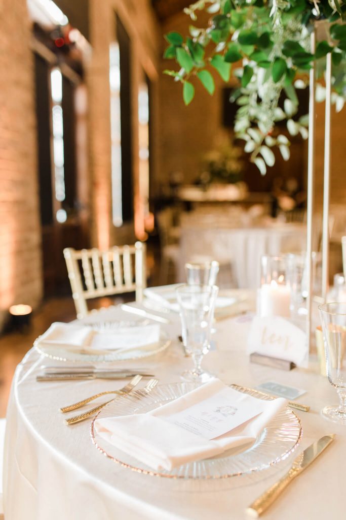 Simple accents of gold were incorporated into the wedding reception decorations with the help of the gold centerpiece pillars, gold cutlery, and elegant gold-rimmed charger plates.