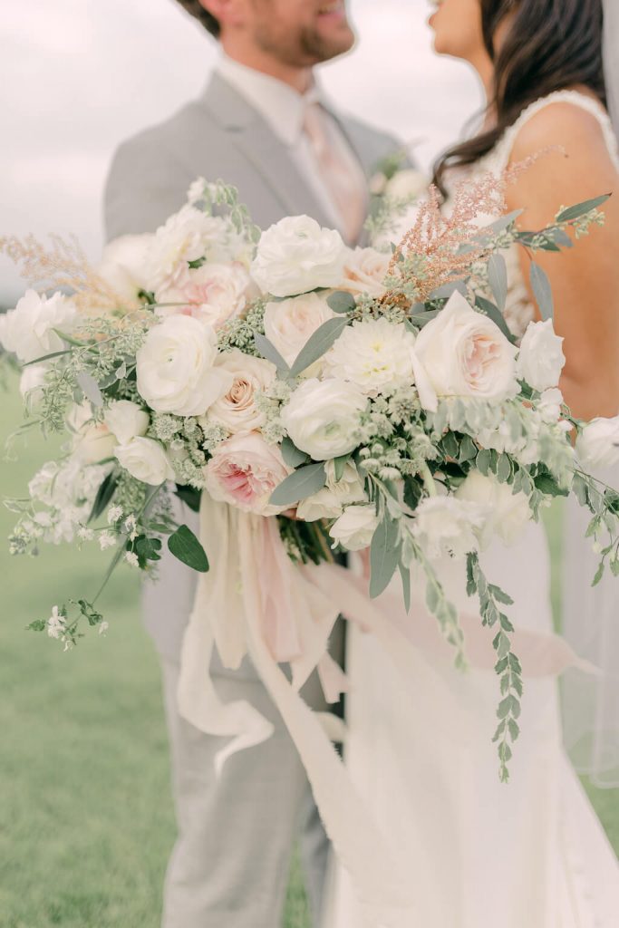 From sweet, soft pinks, muted greens and pops of crisp white flowers to a stunning floral ceremony arch completed with a petal toss recessional. It was a picture perfect day for our beautiful couple that ended as a night to remember. Event coordination by Sincerely Yours Events.