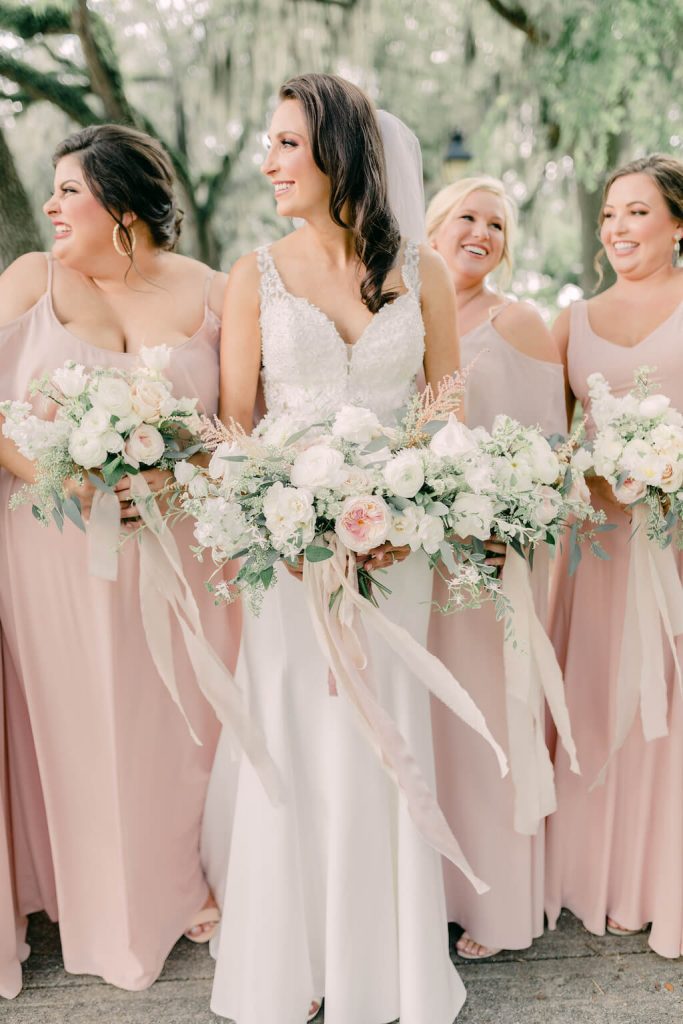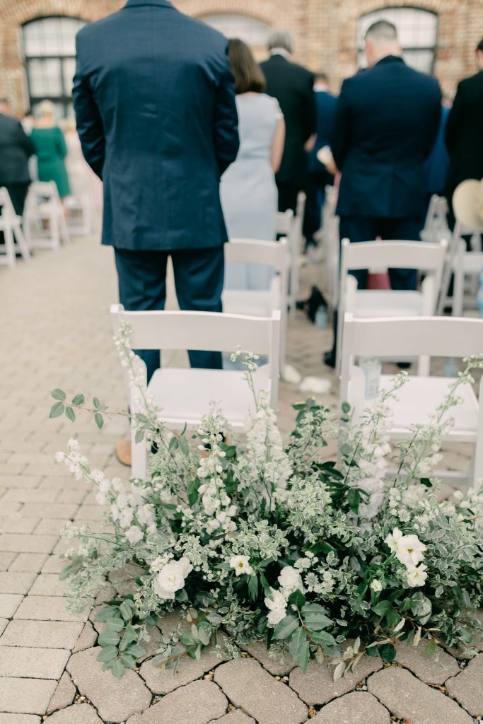 As florists, we love to create unique and stunning designs that are personalized for each of our couples! When it came to the flowers, Katherine specifically asked for no roses. Her vision for the wedding was showcasing the beauty of Savannah, with plenty of nautical details. For the bouquets, we focused on palm leaves and ferns, with all white flowers. Since Katherine didn’t want roses, we made sure to pick large statement flowers like dahlias and ranunculus while giving organic drape and texture with orchids and anthurium.