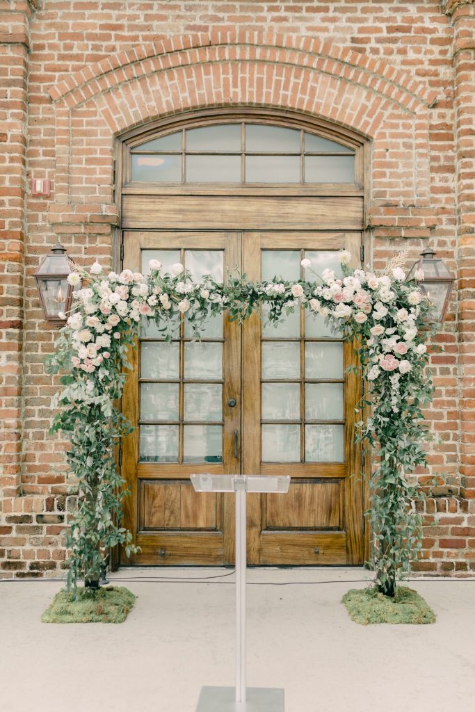 A pair of vintage doors with greenery intertwined were set up on the lawn as an entrance to the aisle, while two beautiful pillar floral arrangements greeted guests to their seats. At the end of the aisle, a simple yet elegant wood wedding arch with greenery was the backdrop for this Jekyll Island Club wedding ceremony. There was something so magical about seeing the vintage doors open as our bride headed down the aisle.