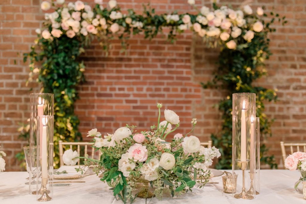 Our team designed classic floral wedding arrangements with white blooms and lush greenery for the ceremony. The aisle was lined with bountiful white blooms that paired nicely with Kristin’s bridal bouquet. Kristin and Teddy met at the end of the aisle and said their vows under a delicate floral wedding ceremony arch. The floral wedding ceremony arch highlighted white blooms of peonies, roses, tulips, and lily of the valley while simple and elegant greenery intertwined among the florals.