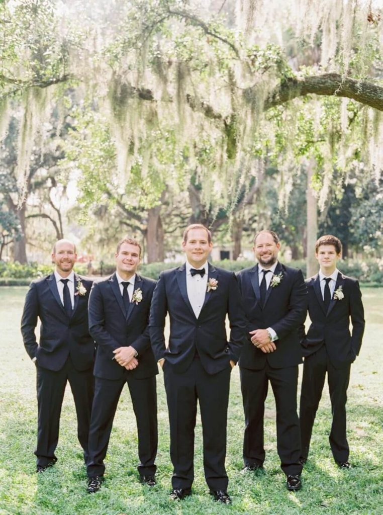 To tie in the nautical elements for the groomsmen, we tied nautical knots on all of the boutonnieres. The coastal theme was tied into the reception as well, which was inside the Savannah Yacht Club. Design Studio South worked with the couple to design a reception that made the all-white flower and tropical greenery stand out. The tables were draped in navy linens and accented with bud vases. The dramatic high ceilings were a focal point of the space, so we created floral statement pieces. The chandeliers were covered in lush palm leaves and greenery that added the most radiant glow as the sun set over the harbor.