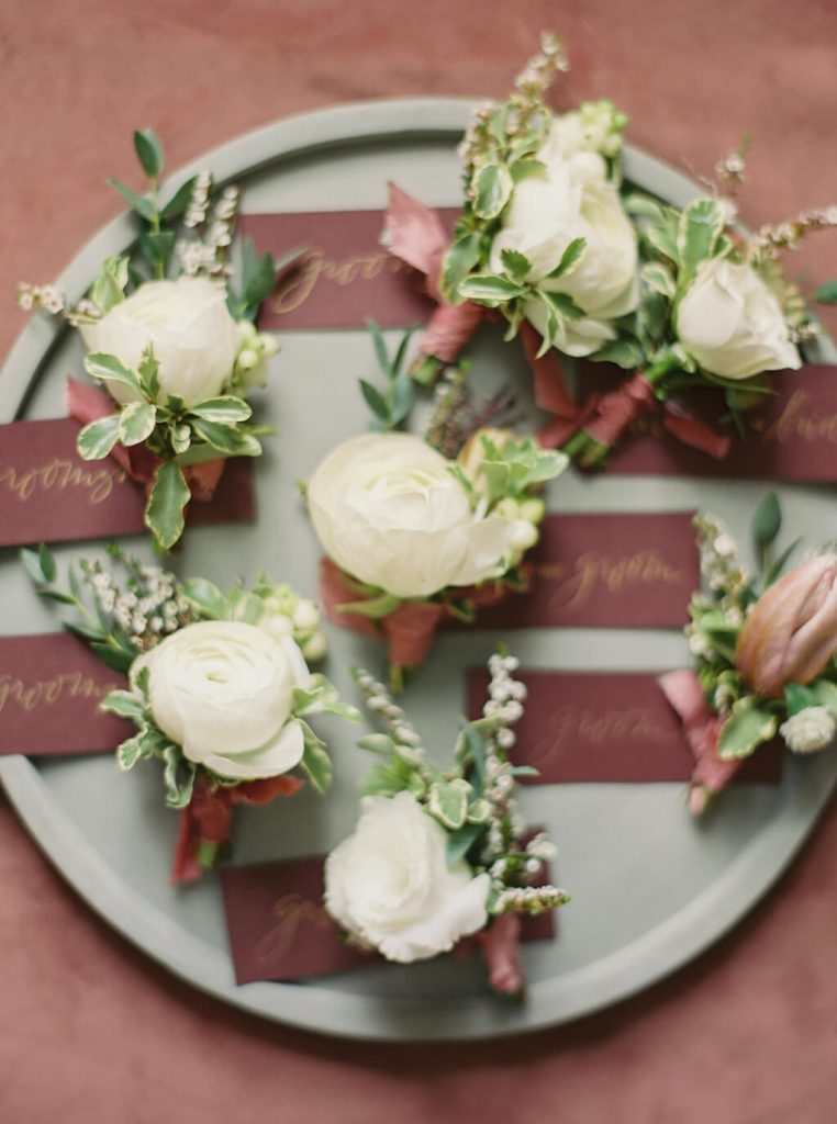 Kait wanted a lovely fall-toned wedding palette with soft creams, marigolds, rust, and mauve. We took color inspiration from her bridesmaids, who all wore gowns in various shades of blush and copper. Kait’s bouquet featured copper cymbidium orchids, tied loosely together with cream ranunculus, mauve roses, and handpicked flowers in shades of honey and blush.