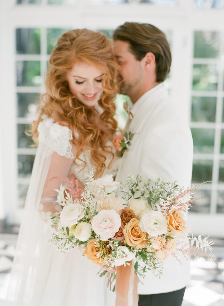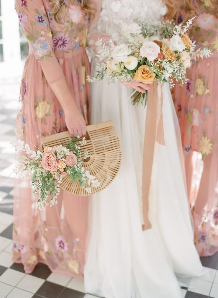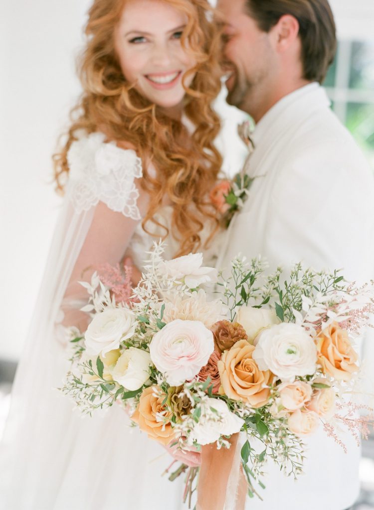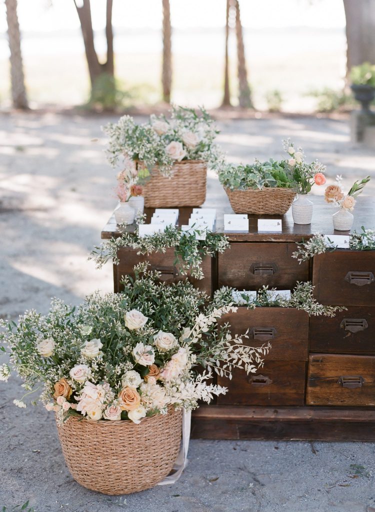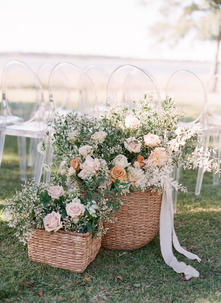 Think “classic southern charm with a twist” – the monarch butterfly was our main source of inspiration for designing the wedding flowers in this Charleston Weddings Magazine feature at Lowndes Grove. Gray Harper owner Andrea wanted the bride’s bouquet to look light and airy – which it totally did! In person, the blooms moved ever so slightly with the wind. We added a dainty foraged shrub to add the perfect amount of femininity without being too “girly.” We kept the traditional colors of spring but mixed in more subdued tones for a sophisticated look. The brown Lisianthus and Combo Roses toned down our spring color palette. Minimal greenery allowed the blooms to stand out since this Charleston venue was already so lush and green. Earth-toned pottery and ribbons rounded out the wedding design.
